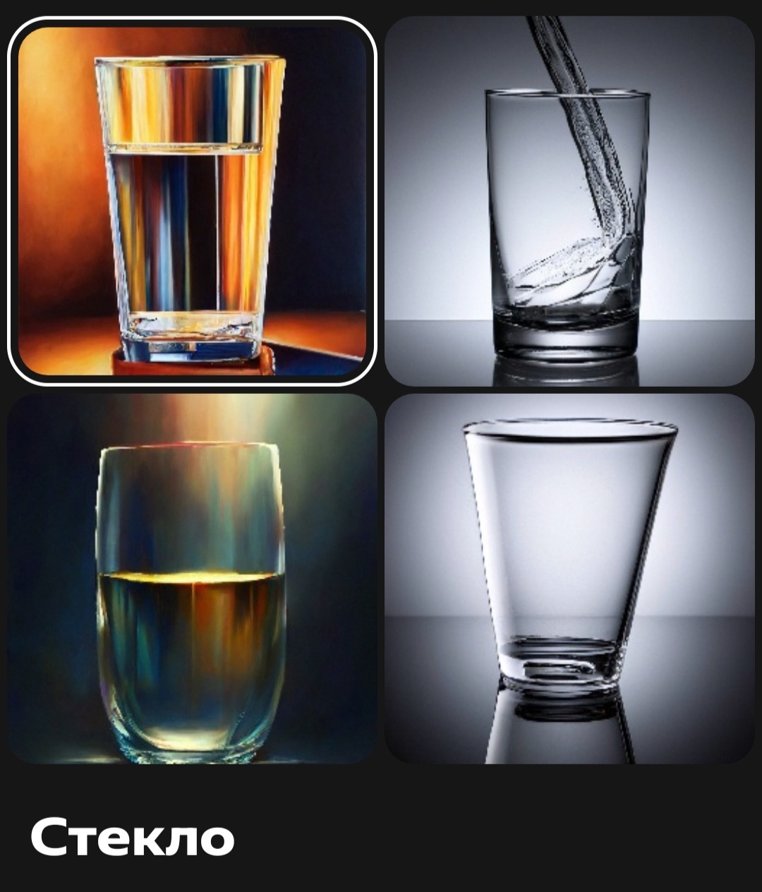К картам и деньгам вопросов нет, а вот стволы странные. Вспомнил, что в оригинале фильм называется "Lock, stock, and two smoking barrels". И ведь действительно, "barrels" нарисовала. Неужели переводит на английский, и использует наиболее прямое и распространённое значение английского слова? Проверим. Попробуем слово "glass", которое хоть и ассоциируется в первую очередь со стеклом, но чаще всего употребляется в значении "стакан". Пишем запрос "стекло", получаем: