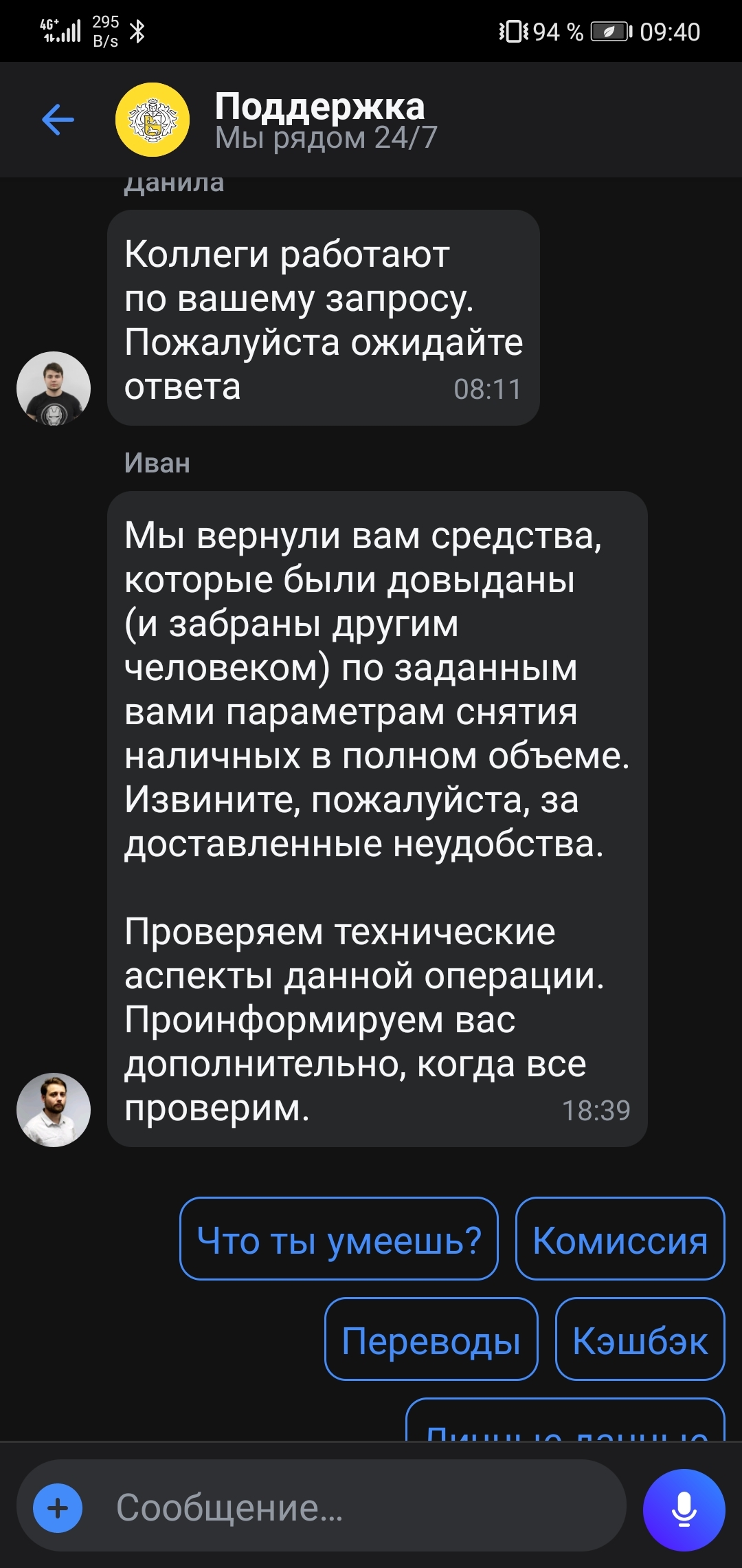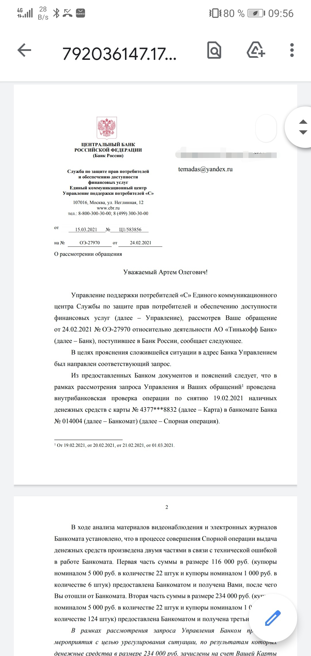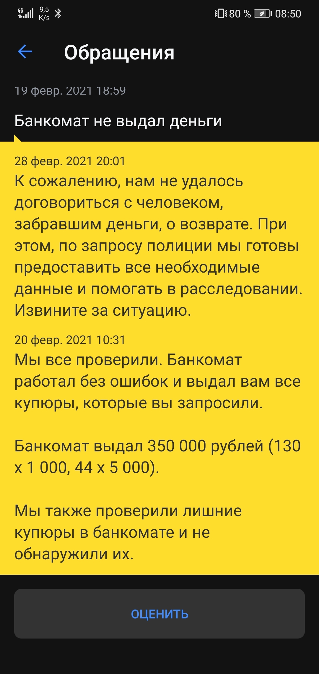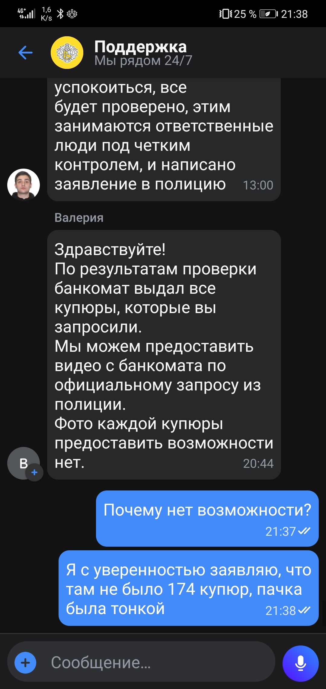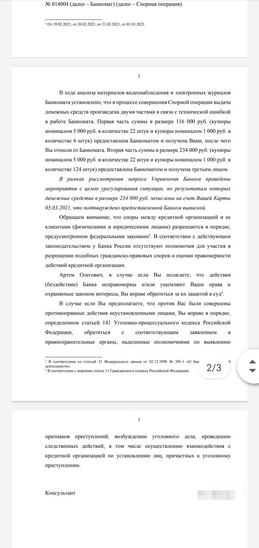2) они признают ошибку, что у банкомата был технический сбой (недопустима выдача средств двумя партиями) и они по логам всё проверили, это их ошибка, почему так произошло они не знают и ещё несколько месяцев им нужно чтобы разобраться. Но, это не даёт понимания, почему в первые 2 проверки они не выявили этой ошибки по тем же логам, как мне говорили, с намеком на то, что я получил свои деньги и ввожу банк в заблуждение, пытаясь получить выгоду. То есть, пока не получили официальную информацию из полиции, видеозапись и пока на них не спустился гнев вышестоящих органов (об этом ниже), никто не хотел суетиться, а проблемы клиентов - шерифа не волнуют.
