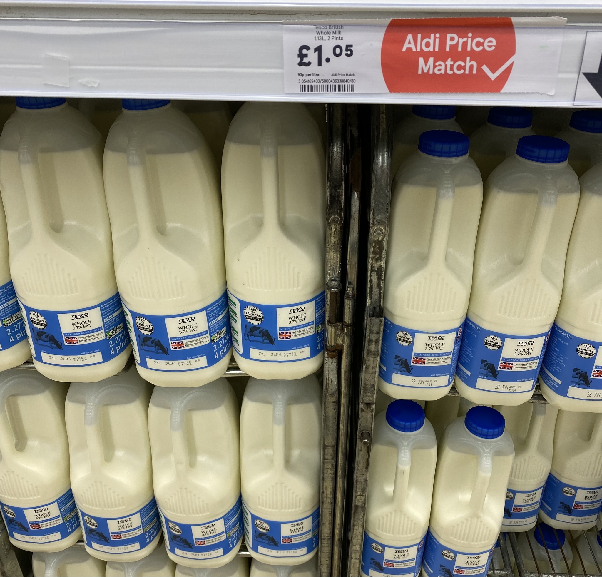 Молоко. 2 пинты (1.13 литра) - 73.6руб или 66.7р за литр