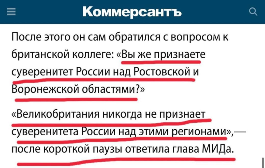 После этого он сам обратился с вопросом к британской коллеге: «Вы же признаете суверенитет России над Ростовской и Воронежской областями?»