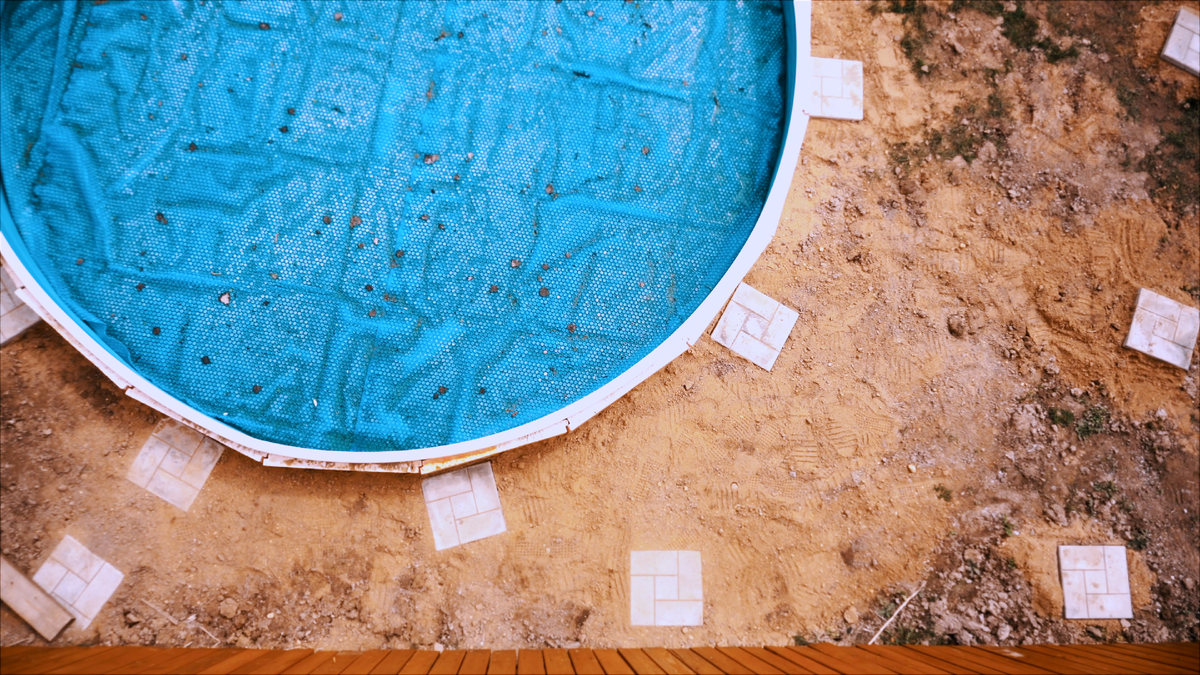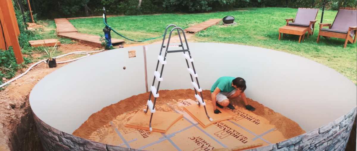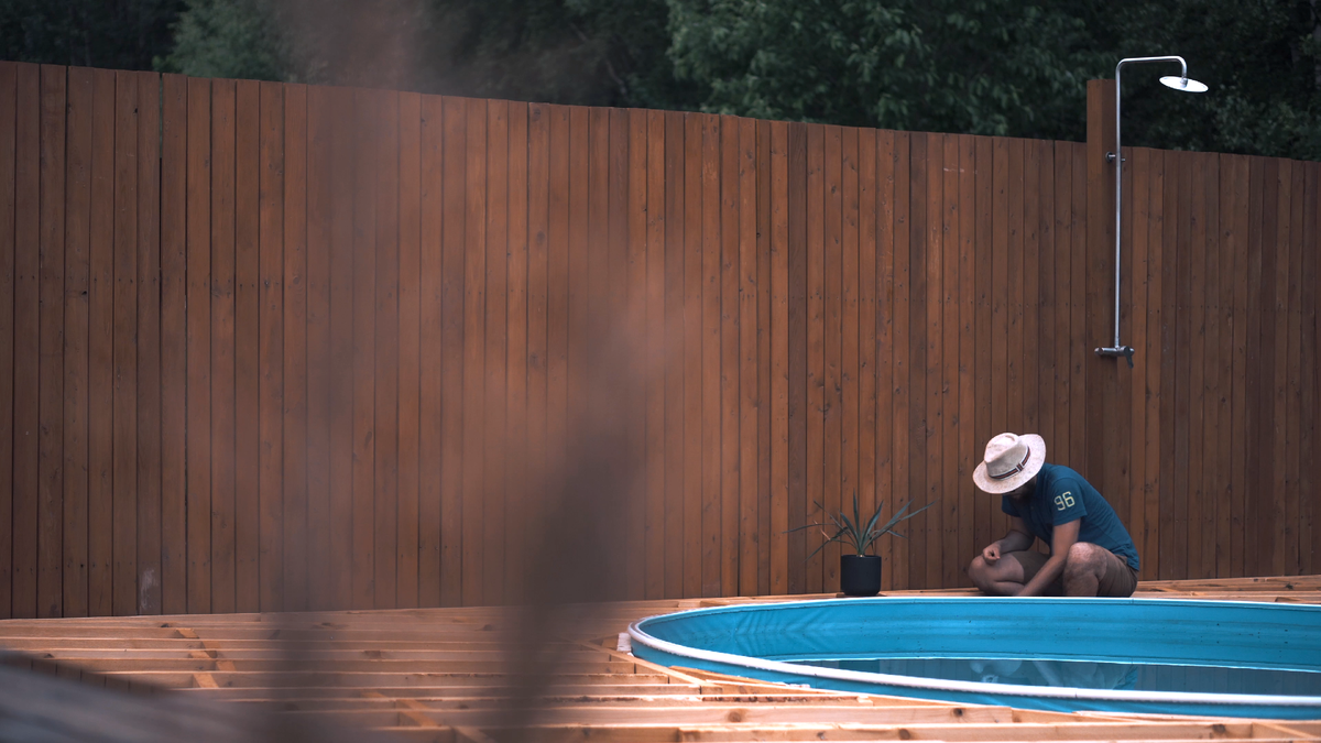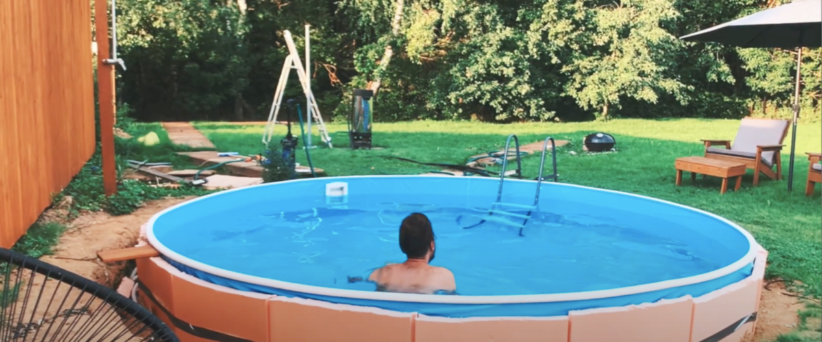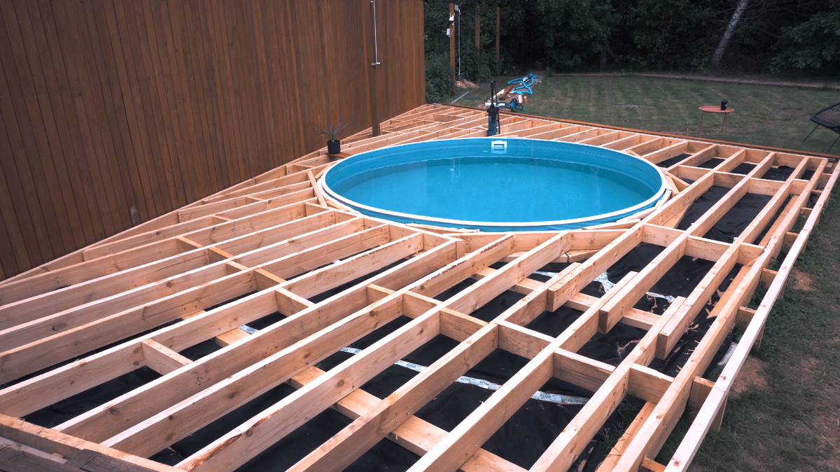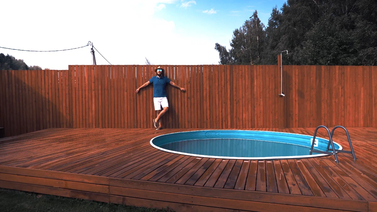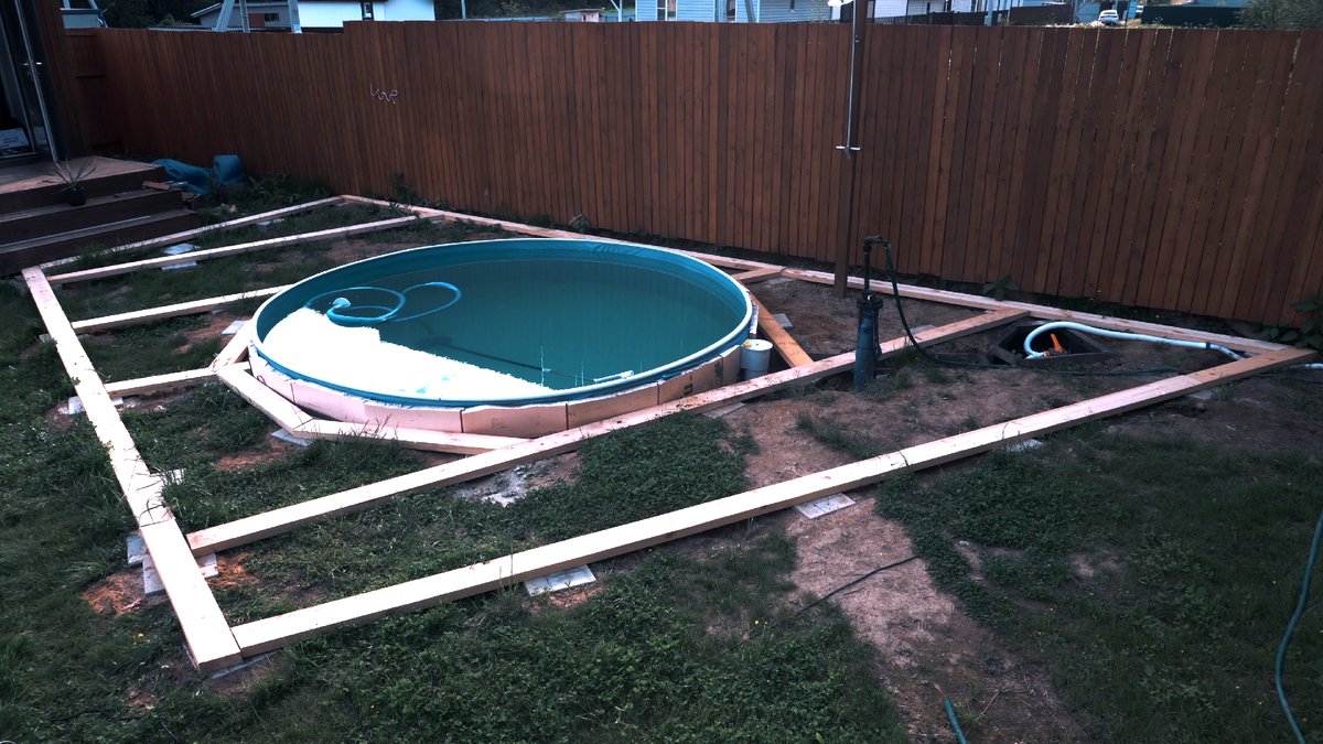 Причем, задумка была сделать деревянный настил на уровне верхнего края бассейна, чтобы создать иллюзия обычного стационарного бассейна (как мы привыкли видеть в кино).