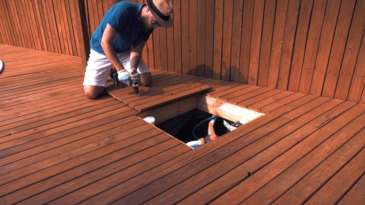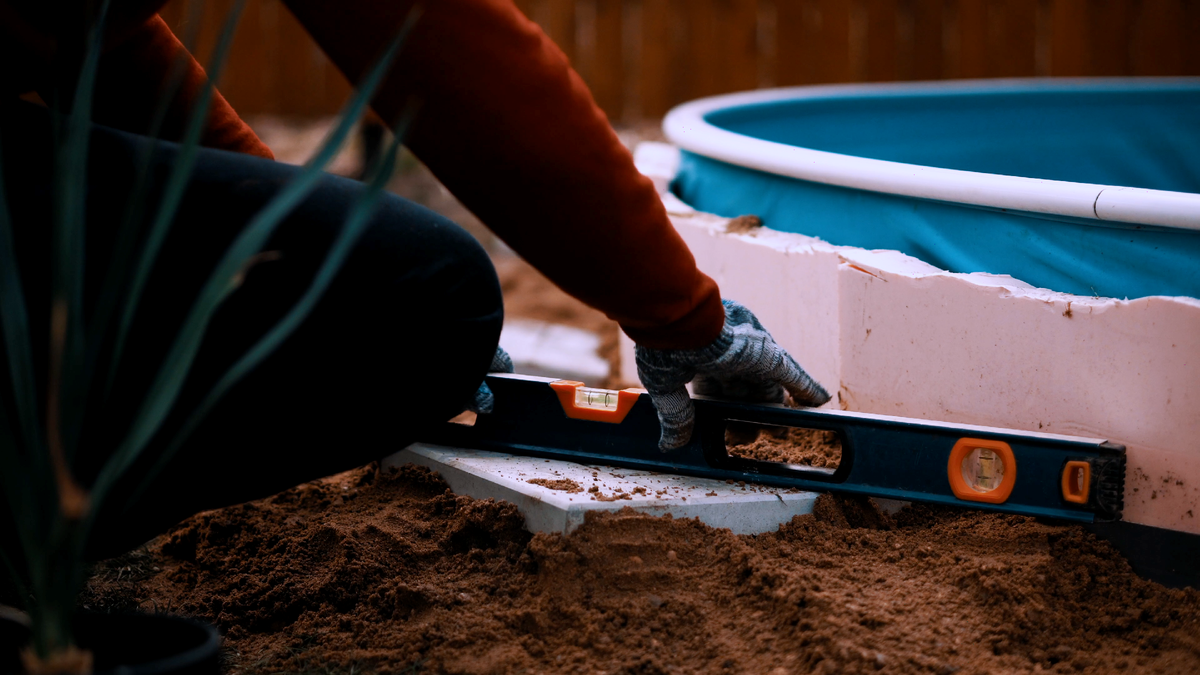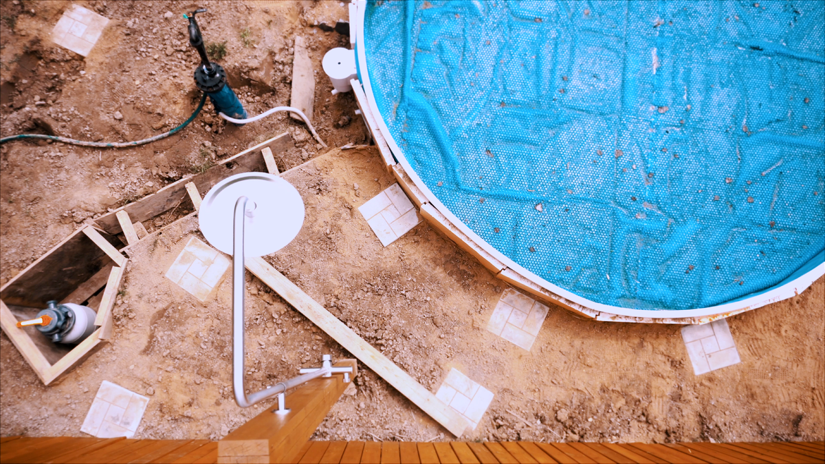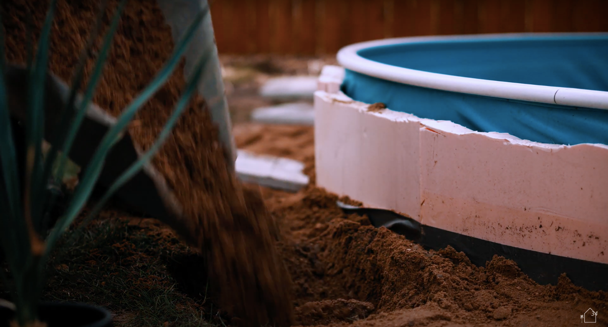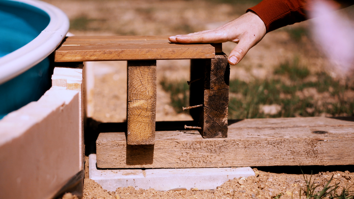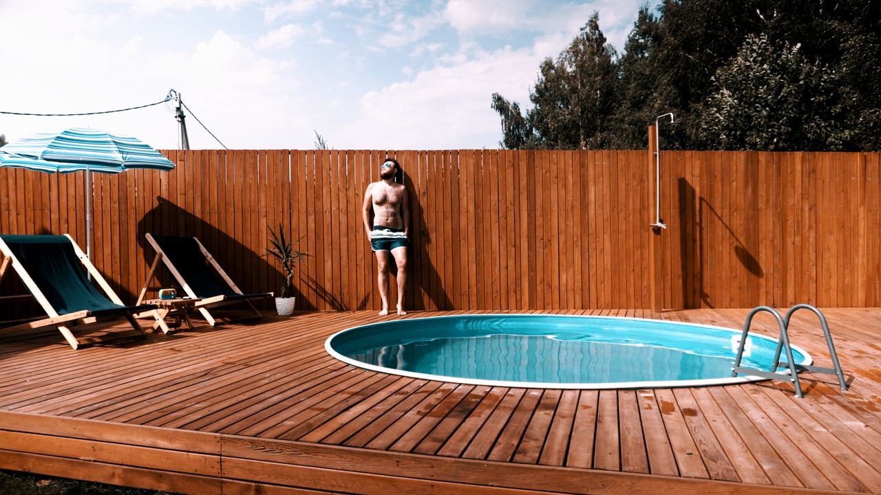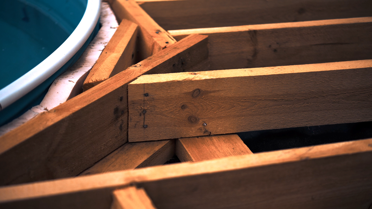 Причем, задумка была сделать деревянный настил на уровне верхнего края бассейна, чтобы создать иллюзия обычного стационарного бассейна (как мы привыкли видеть в кино).