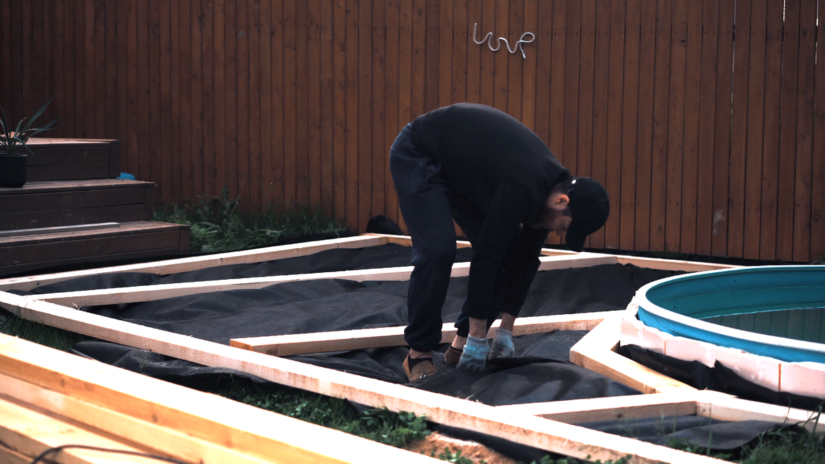 Под лежни подкладываю геотекстиль, чтобы не прорастала трава сквозь будущий настил.