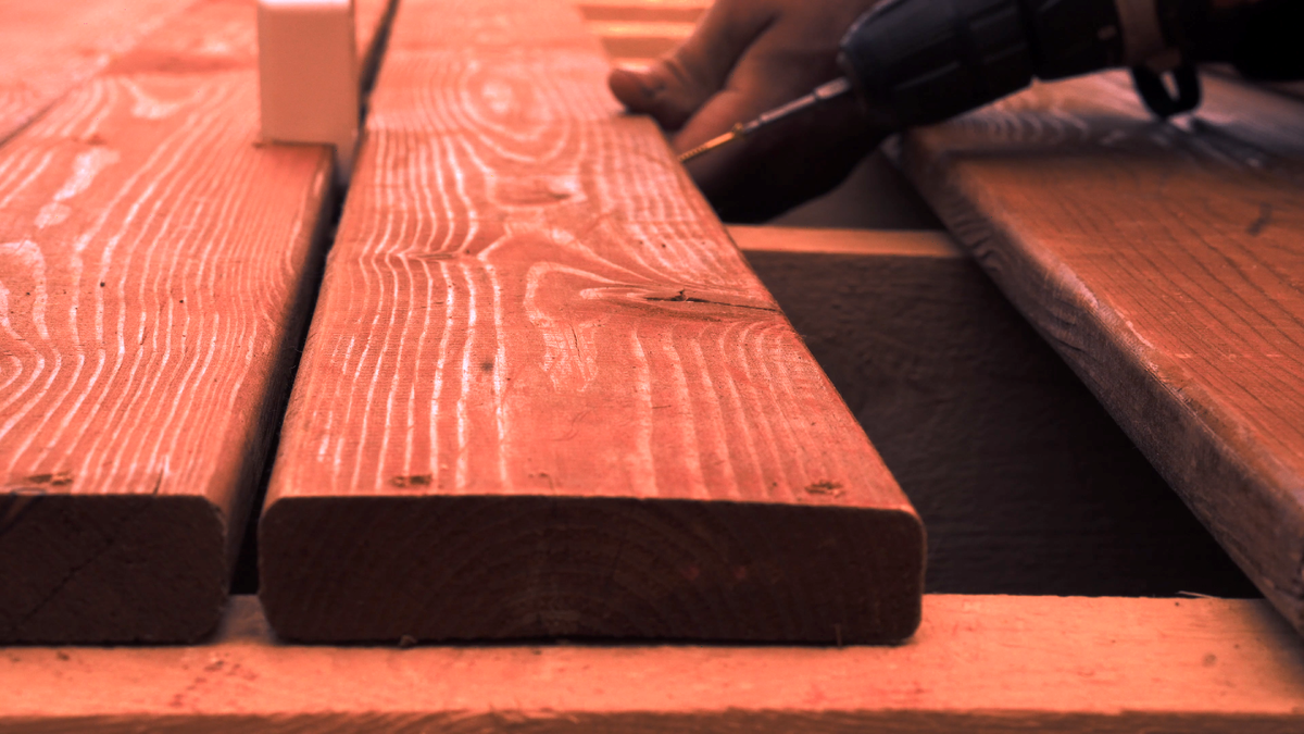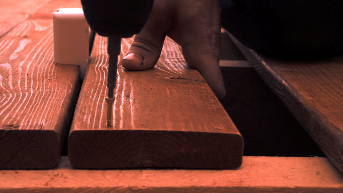 Между досками делаю зазор около 0,5 сантиметра с помощью некой пластиковой штуки, которая попалась под руку. Доска в сырую погоду набирает влагу и значительно расширяется, поэтому без зазоров никак. Креплю доску на самозасверливающиеся саморезы с потайной головкой типа "Спакс". Кручу по два самореза.
