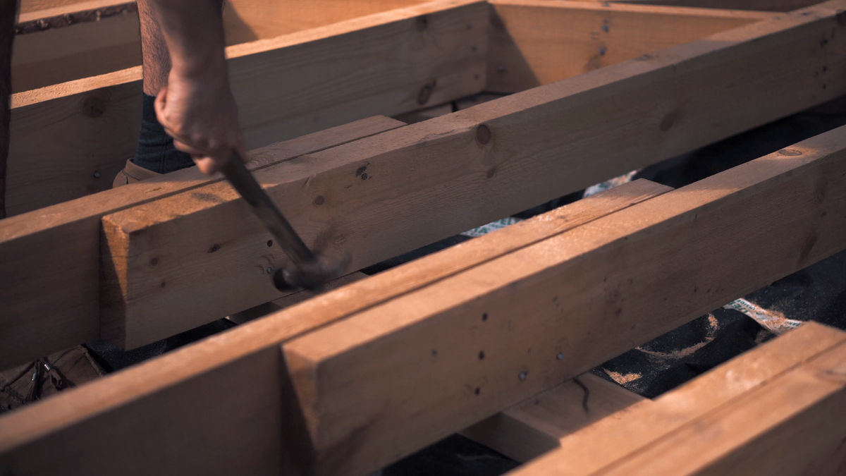 Долго-долго проколачиваю все лаги. По три гвоздя на ширину доски (по одному гвоздю на каждые 50 мм доски). Рука в приятных рабочих мозолях) Мотивирую себя будущим результатом, который держу в голове.