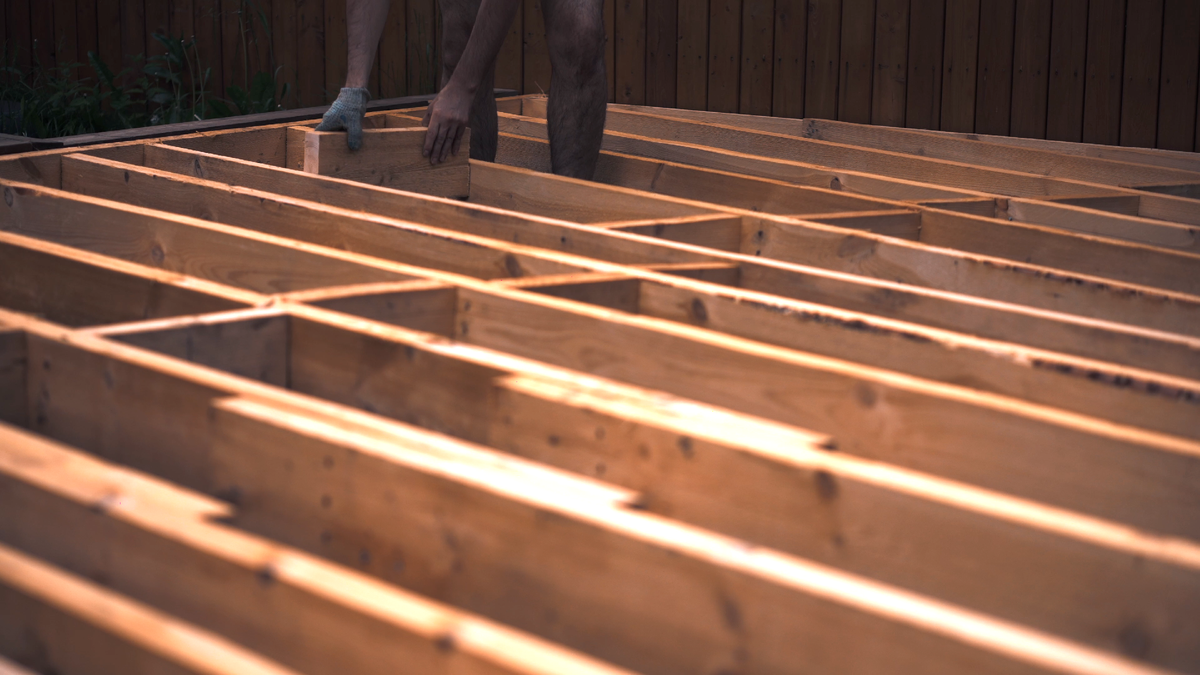 Начинаю раскладывать лаги с шагом 300 мм, как уже говорил. Такой маленький шаг нужен, чтобы моя финишная доска 90 на 20 мм не прогибалась. Если в качестве финишной доски брать что-то более массивное, то шаг можно делать меньше.