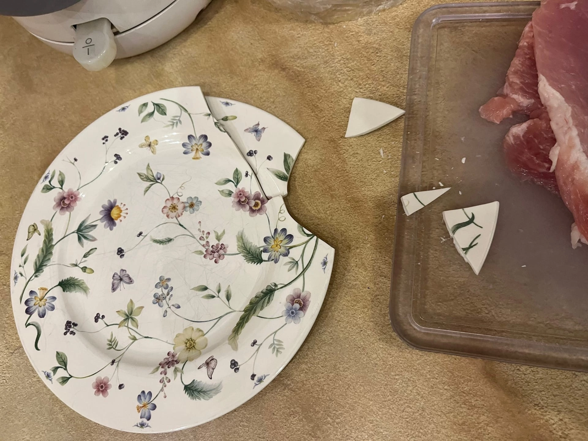 Думаю всем понятно, что ругать за это не стоит? Убрали вместе, в душе погоревали, достали новую тарелку.