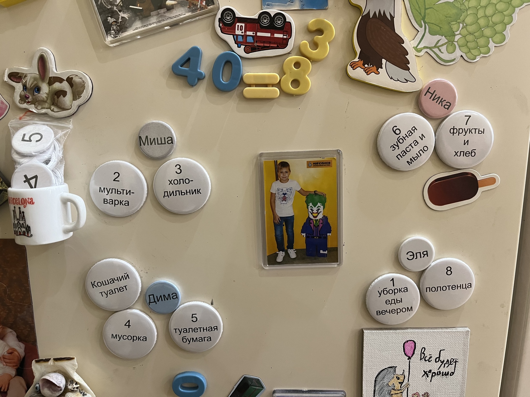 Еще у нас отдельно четкое расписание уборки на кухне каждый день, попарно. Чтобы учились общаться и договариваться друг с другом. И каждую неделю меняется дежурный у кошачьего туалета - по часовой стрелке.