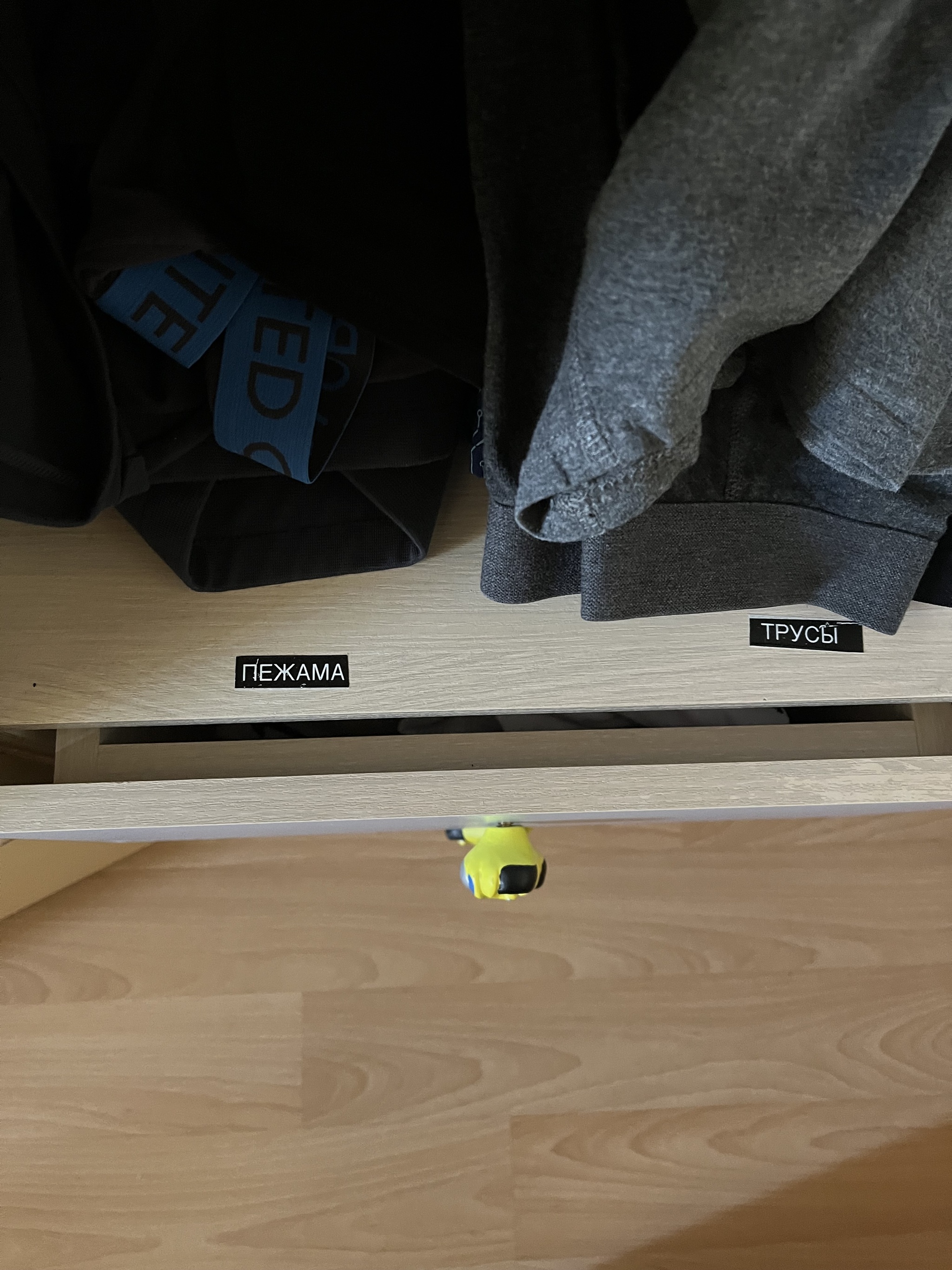 4. Порядок в вещах. Все ящики у всех детей функционально одинаковые. Внизу нижнее белье, выше - шорты и футболки, еще выше штаны. На штангах слева - всегда школьное. Сначала даже подписывали полки - с помощью ручного принтера (дети сами печатали слова, что впрочем заметно на фото).