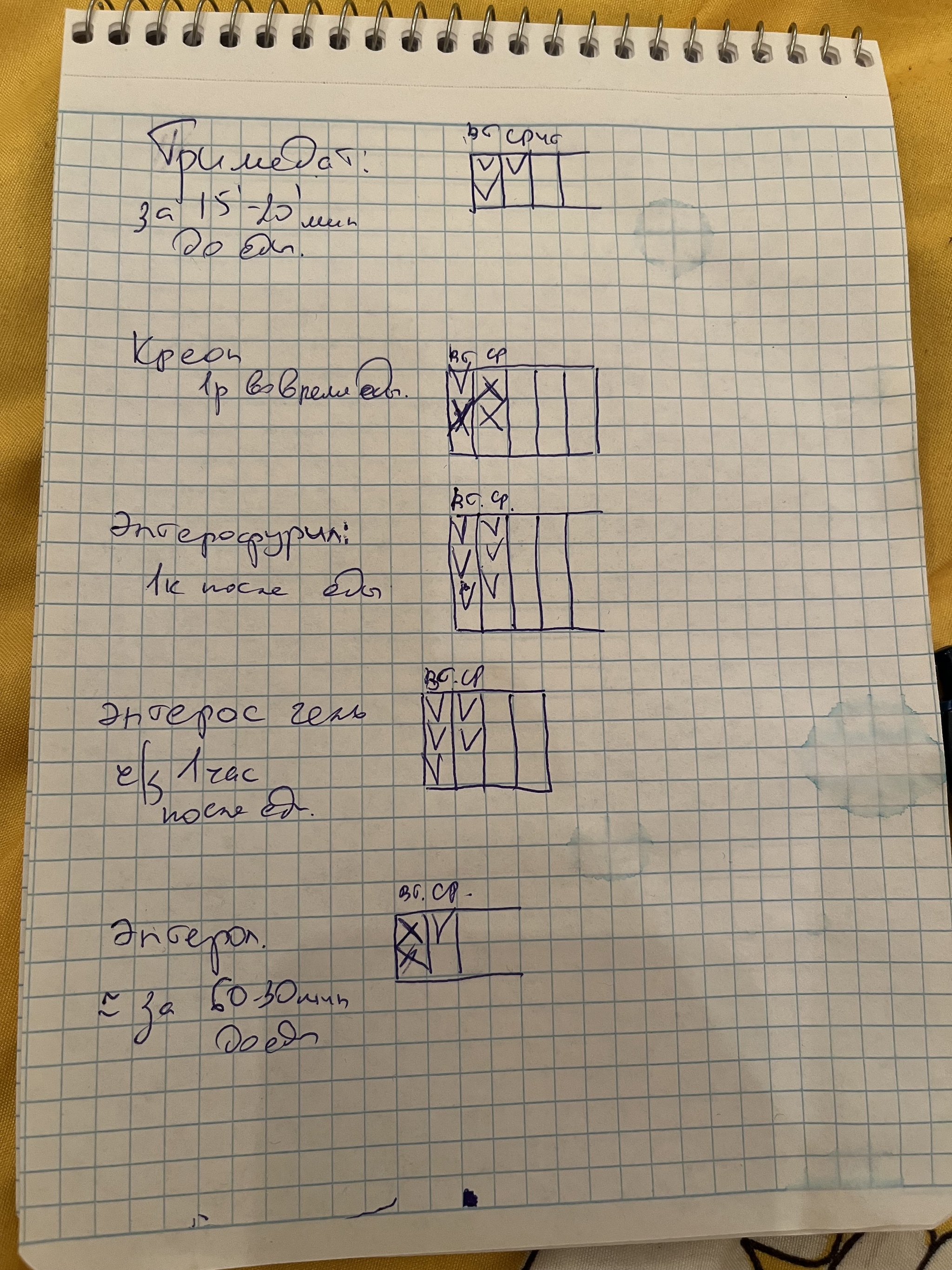 11. Лекарства. Держу под контролем, но приучаю к порядку. Допустим, врач прописал что-то. Составляем таблицу, нужные кладу в коробку в зоне доступа больного, и он принимает по списку. Старшие - уже сами могут взять из блистера и отмечаются. Младшие - пьют со мной вместе, и отмечаются.