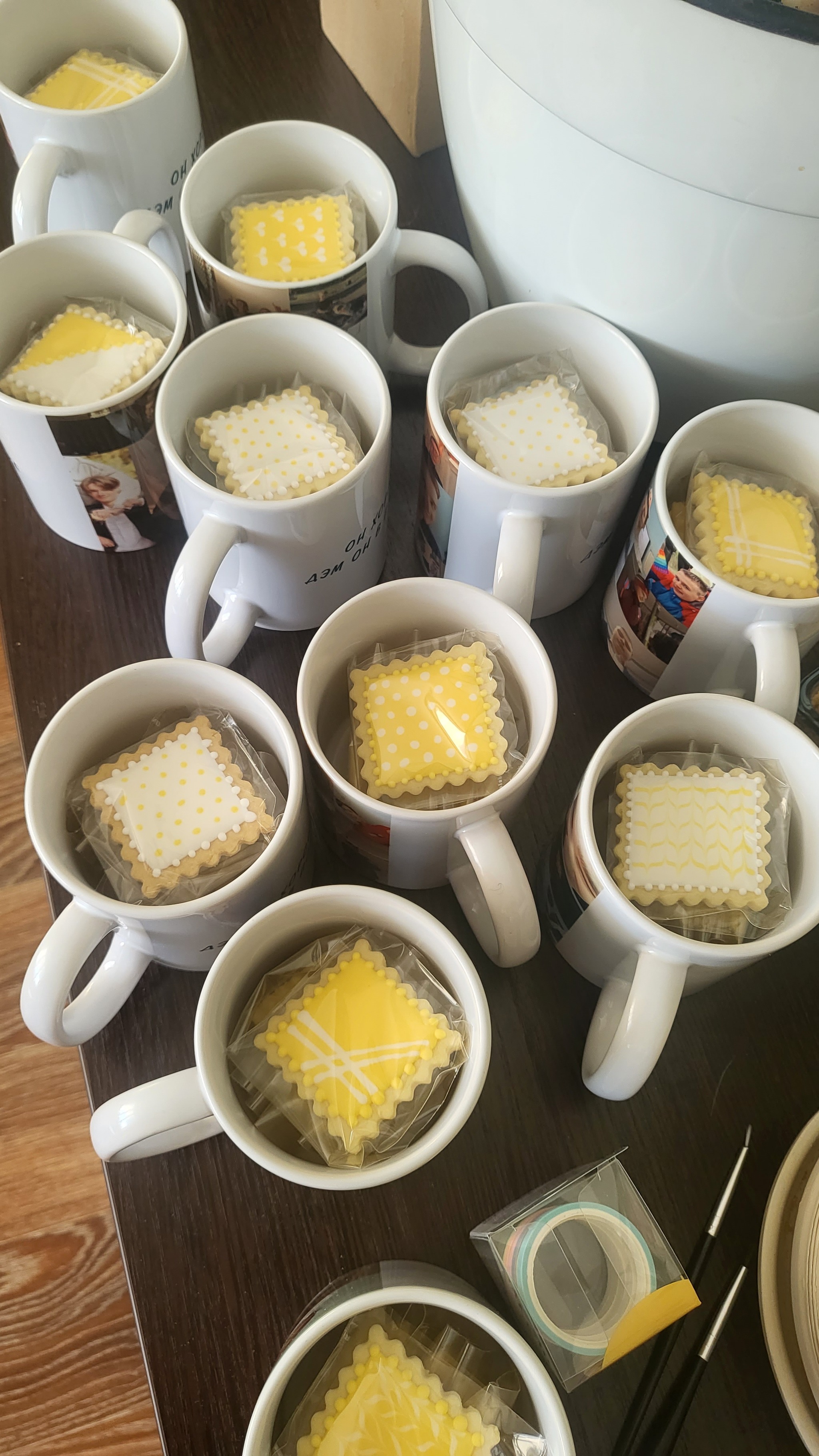 Дочь кружки и печенье раскидала по пакетам, аккуратно и вдумчиво, чтоб не запутаться) И накрутила бантиков из джутовой бечевки.