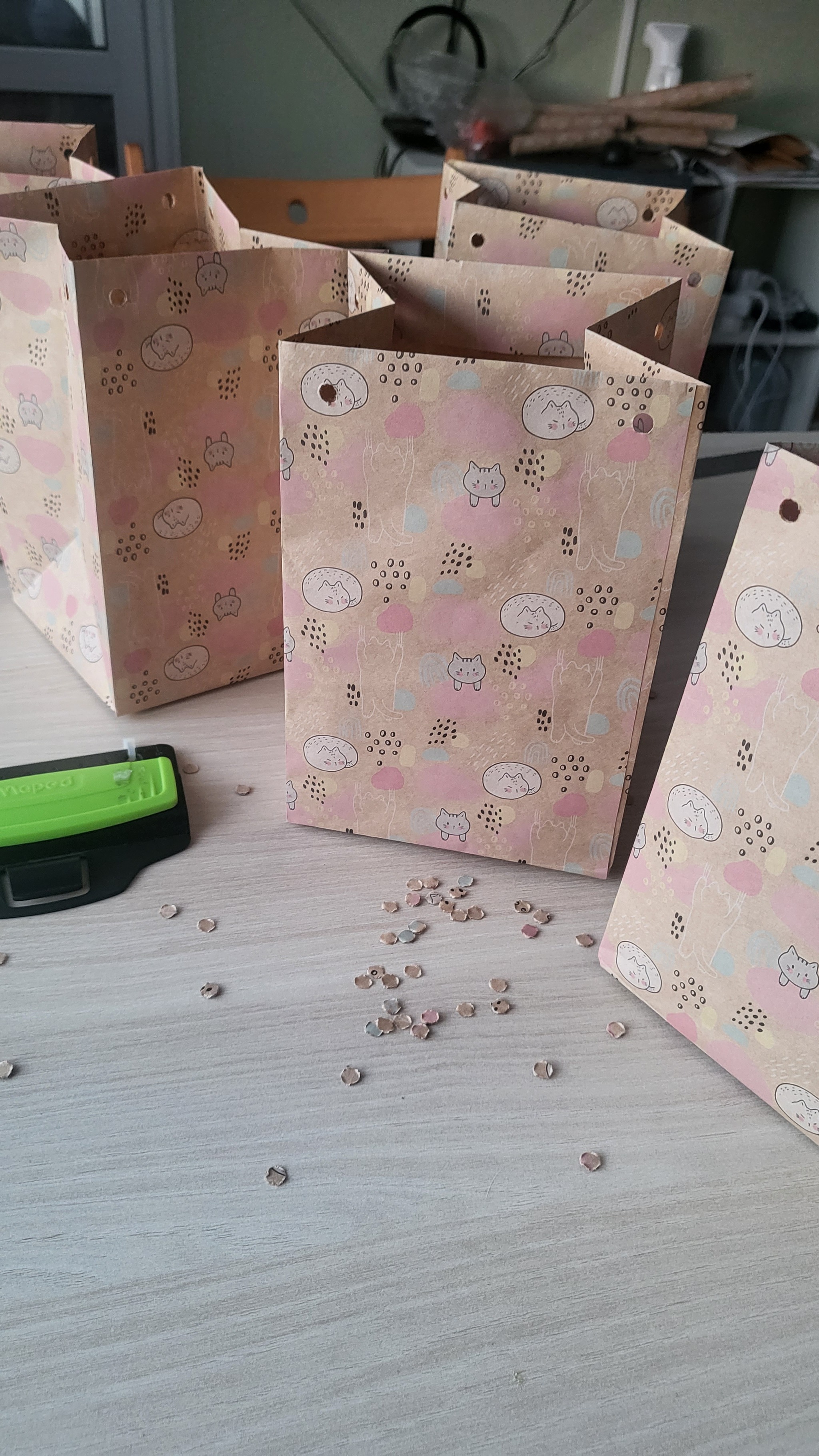 Из крафтовой бумаги я настрогала пакетов. Можно было бы и купить, конечно, но шанс купить в нужном количестве, нужного размера и приличного вида у нас невелик. Да и всяких надписей и блестючек не хотелось. Эта бумага нам очень нравится.