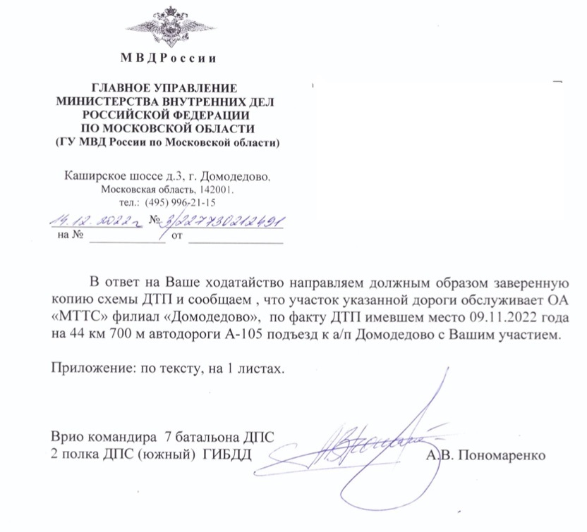 ГИБДД бодро ответил через 20 дней, написав, что интересующий меня участок дороги обслуживает АО МТТС филиал Домодедово (по ИНН он же АО «Мостотрест-сервис»).