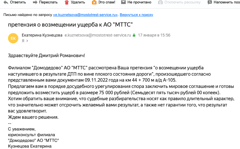 Он опровергает миф о том, что предъявлять претензии к дорожникам за некачественное обслуживание дорог бессмысленно. Смысл, как мы видим, есть и - более того! - можно даже обойтись без суда и дорогостоящих юристов/адвокатов, достаточно только согласиться на 75 000 рублей, которые дорожники любезно предлагают мне совершенно бесплатно, то есть даром!