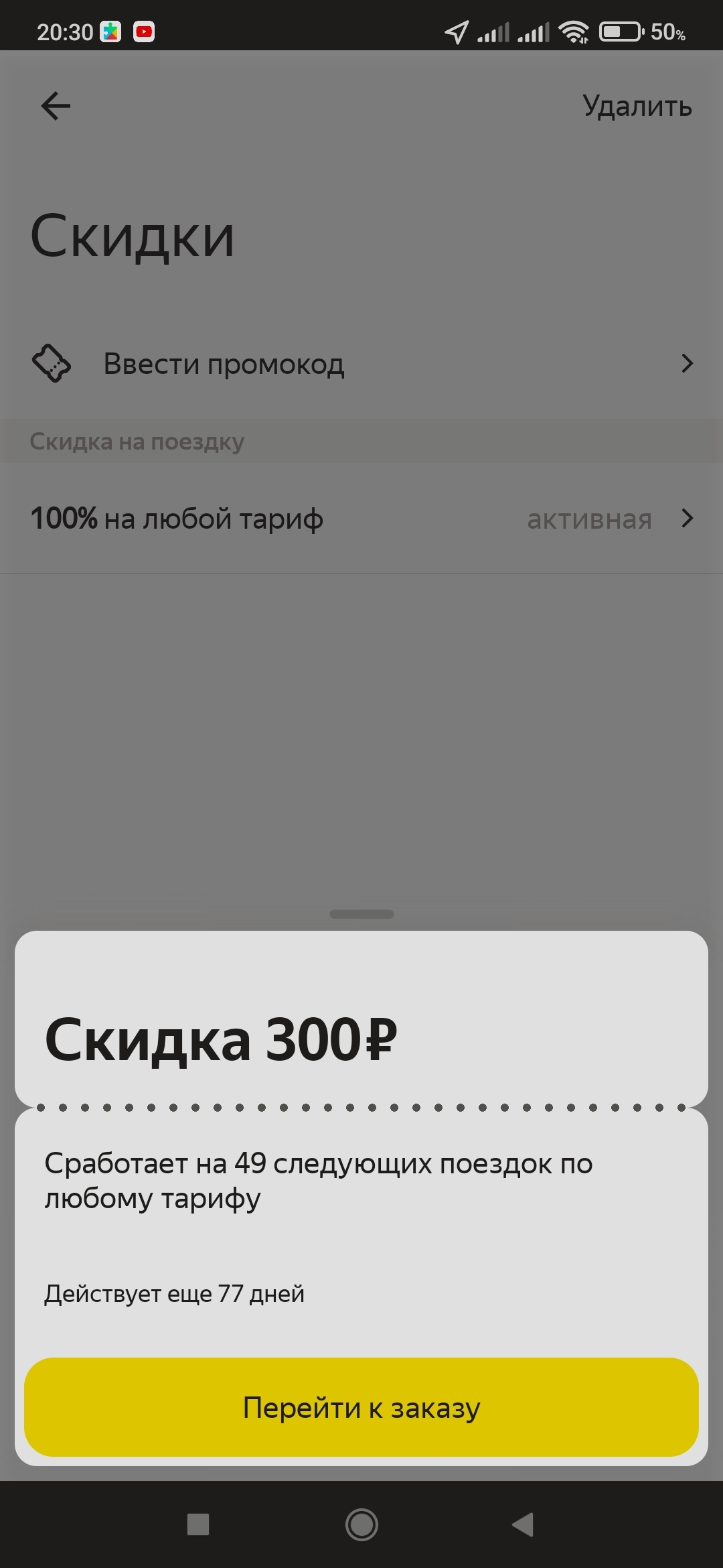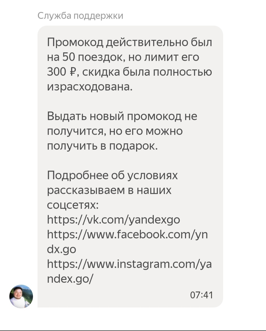 Дабы урегулировать ситуацию мне позвонила служба поддержки ЯндексТакси и за то, что я стойко и храбро решил залечить раны дома, пообещали выдать трехсотрублевый промокод на пятьдесят поездок!