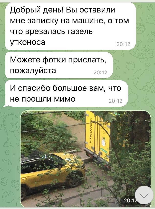 Только что. Сижу дома, слышу характерный звук ломающегося пластика и звук сигналки. Гляжу в окно. Грузовичок "Утконоса" откатывается от припаркованной машины. Выходит водитель, осматривает. Я делаю фото. Отвлекаюсь на несколько минут. А этот негодяй уезжает. Ну что ж.