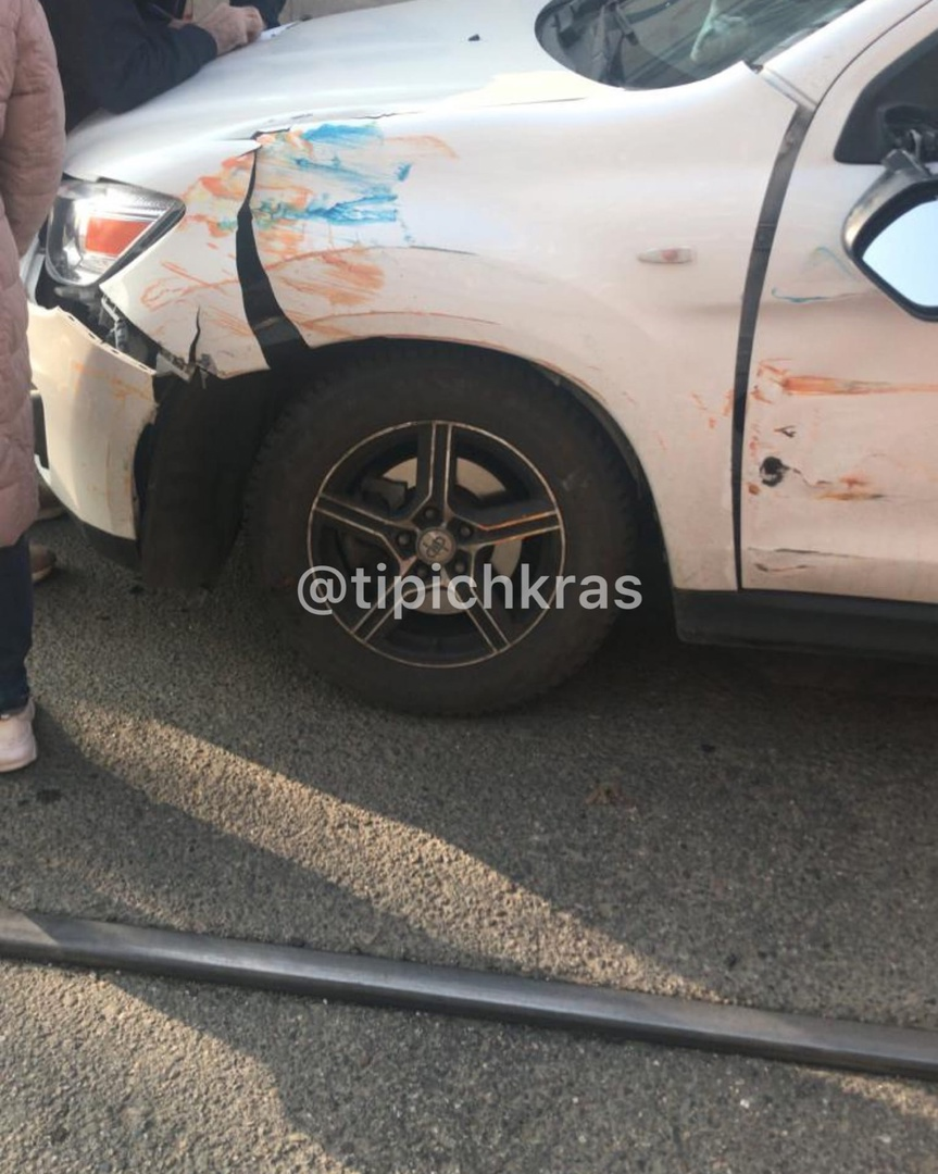 На перекрёстке улиц Гоголя/Железнодорожная водитель трамвая поехал напролом через припаркованные на рельсах автомобили, оставив мешающим машинам вмятины и следы своей краски на память.