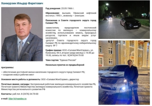 Виновником ДТП является сын депутата от «ЕДИНОЙ РОССИИ» совета городского округа города Салават, владельца ООО «СалаватЖилСервис» и ООО «БашЖэк», Ильдара Фаритовича Ханмурзина - Герман Ханмурзин. Герман, находясь за рулем дорого автомобиля марки BMW, вероятно не справился с управлением, превысив скоростной режим.