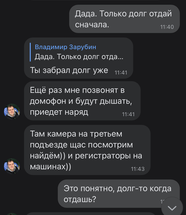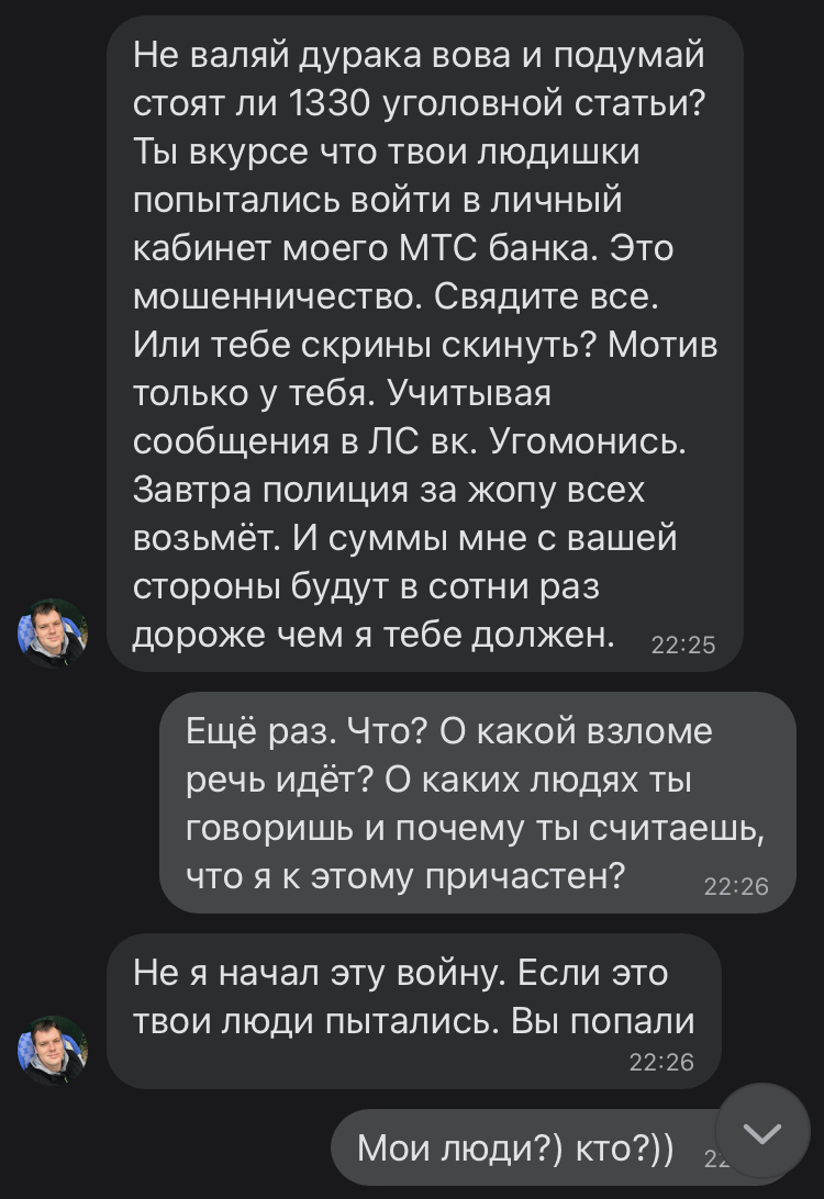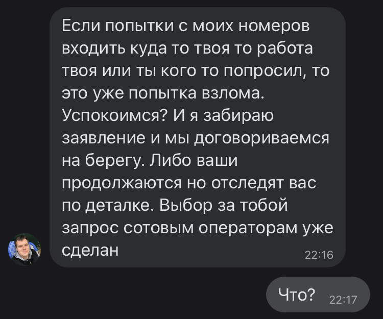 Понеслись угрозы в мой адрес. Голосовыми сообщениями. Их я скринить не стал, ибо смысла нет.