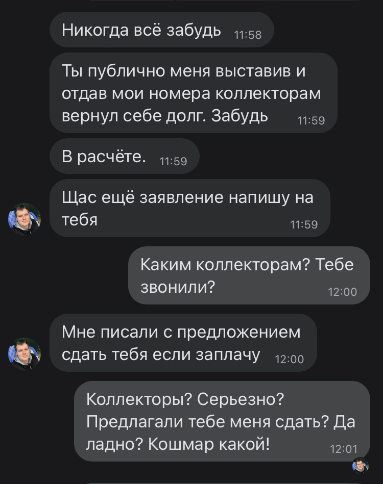 Обвинил меня во всех своих фантазиях: и коллекторы. И хакеры. И звонят ему в трубку и дышит кто-то. И номер-то его взламывают. И банк взламывают. И номер, оказывается, знаю только я. Короче жду я, пока меня в отдел вызовут. Посмотрим что скажут.