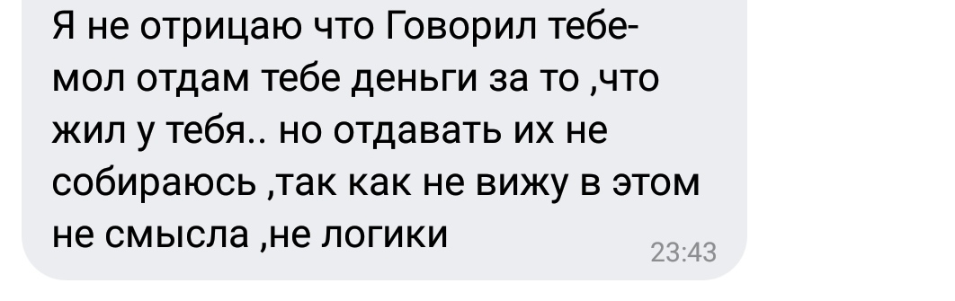 Жил у меня коллега по работе. Разошёлся со своей дамой сердца, проблемы по деньгам, кредиты, попросился на время. Ну мне что, жалко? Только ты пользуешься ресурсами, будь добр закинуть какую-то денежку, ок? Ок. Месяц-полтора он прожил, потом резко уволился одним днём и улетел в Питер. Через джва года волей судеб оказался там же, решил напомнить про обещанное. Итог ниже