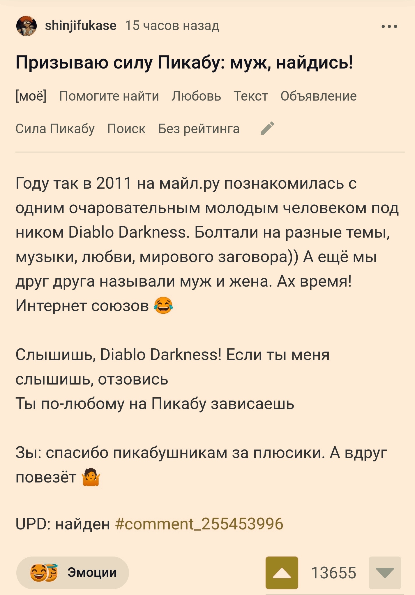 Тут был пост на днях, от девушки, которая потеряла мужа и не могла его 10 лет найти. И вот мы его нашли с "божьей" помощью.