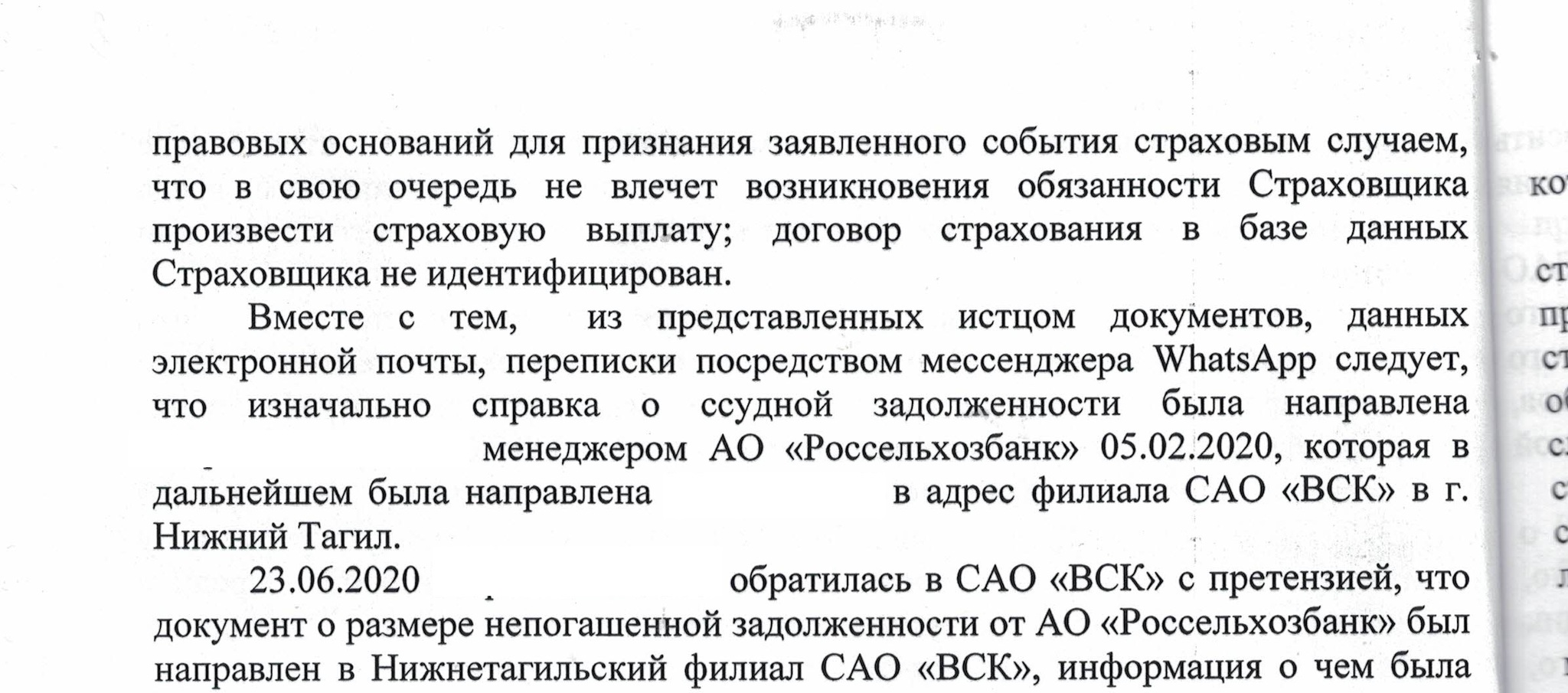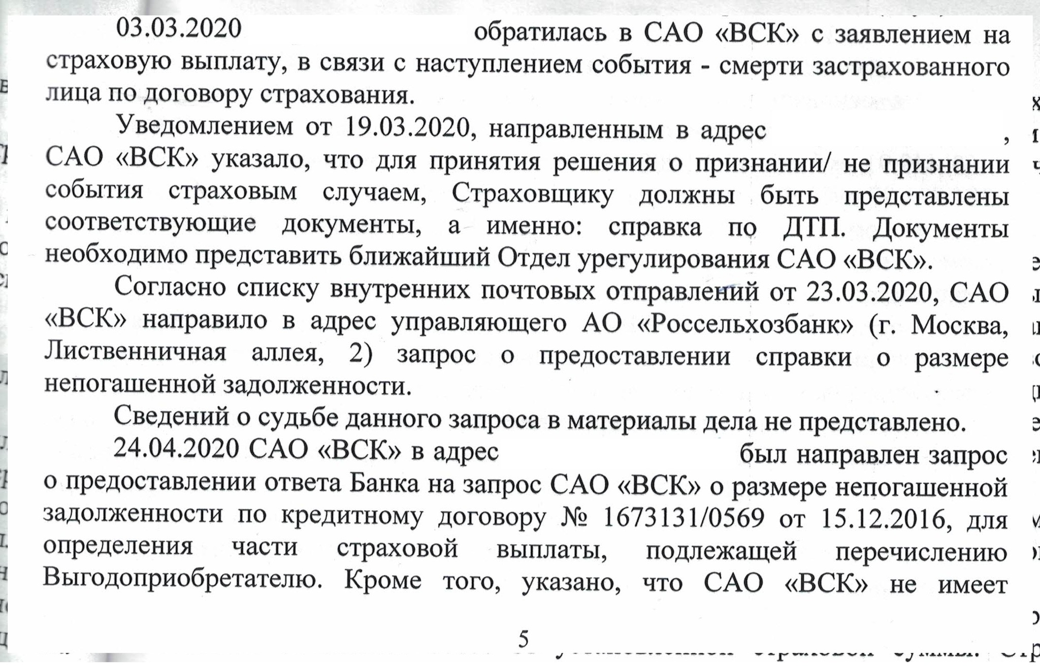 В декабре 2019 года они попадают в ДТП и погибают, у них остается дочь. Дочь как наследница обращается в САО "ВСК", сообщает о наступлении страхового случая и просит перевести денежные средства на погашение Ипотечного кредитного договора. (К сожалению получить разрешение на публикацию материалов дела не удалось, поэтому буду использовать для иллюстраций выдержки из решения суда.)