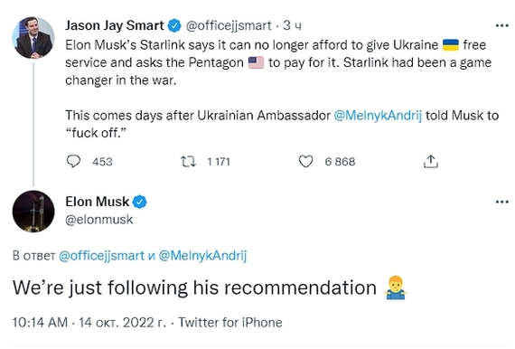 Это произошло через несколько дней после того, как посол Украины Андрей Мельник сказал Маску «отъебись»."