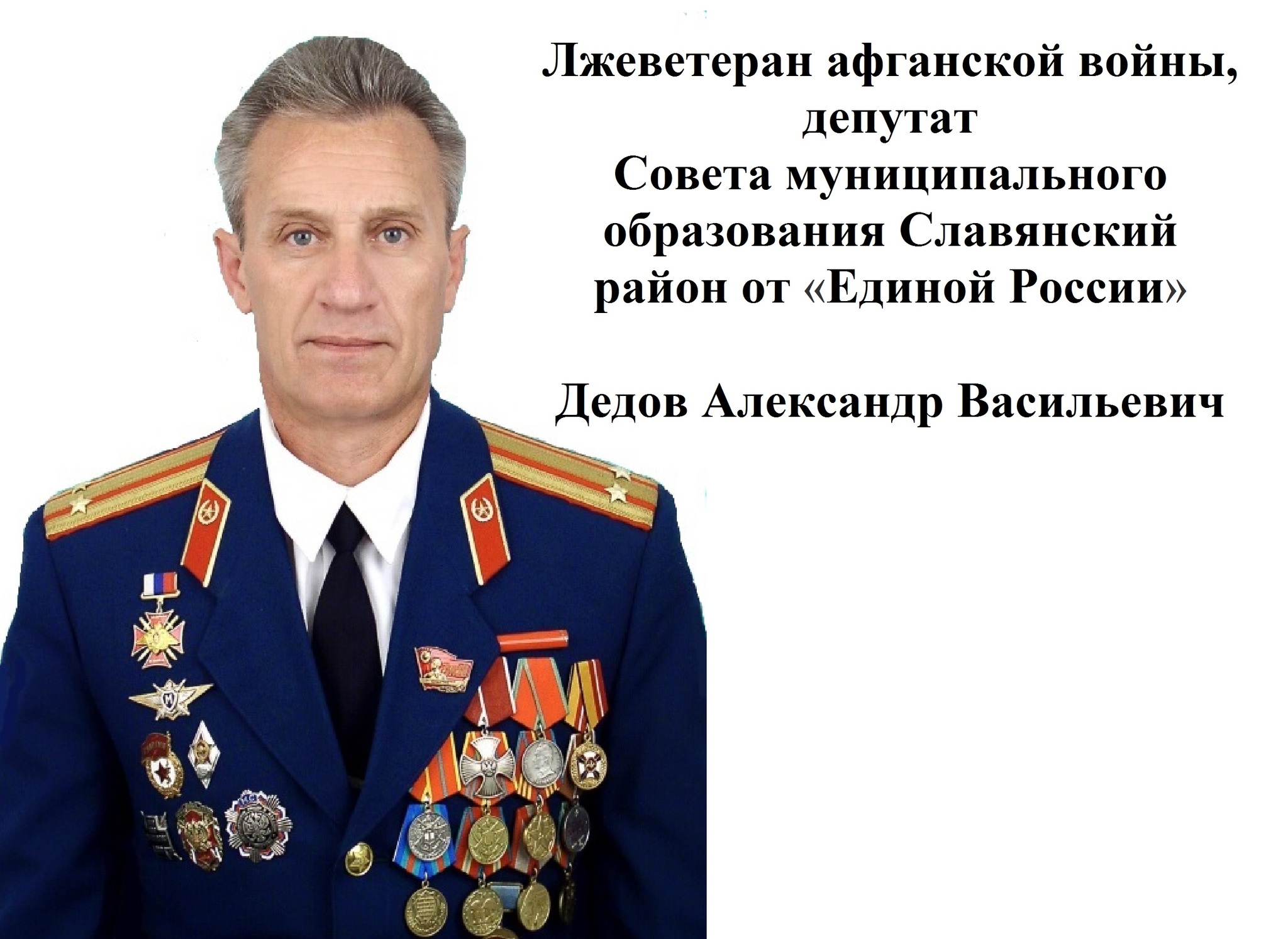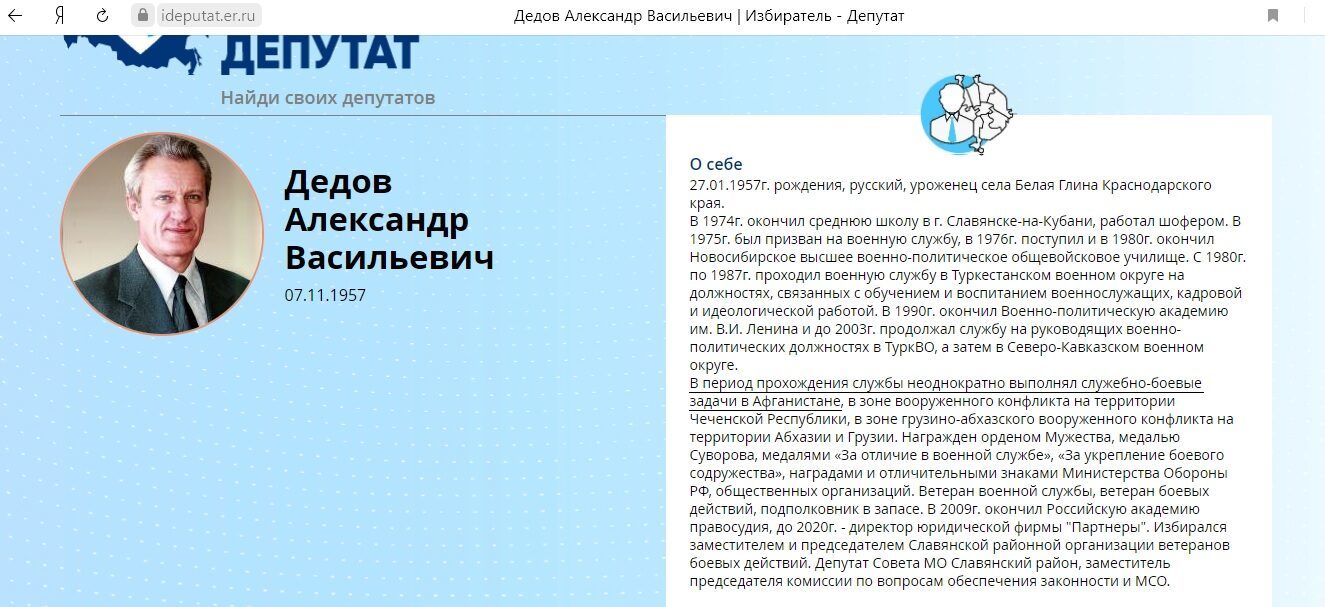Но, самое удивительное во всей этой истории, что депутат Дедов А.В. является депутатом уже 4 созыв подряд и все это время, указывает и рассказывает избирателям то, что был в Афганистане,но ветераны-афганцы в его родном Славянске-на-Кубани даже не знают где он был,потому что на их прямые вопросы он уклоняется и придумывает различные вариации своего пребывания в ДРА. Также стоит отметить, что депутат Дедов А.В. занимает пост заместителя председателя комиссии по вопросам обеспечения законности, безопасности, правопорядка, местного самоуправления и депутатской этике в Совете муниципального образования Славянский район.