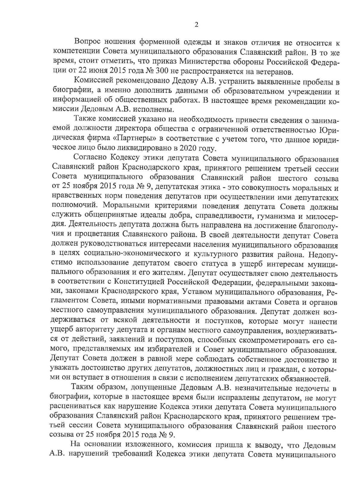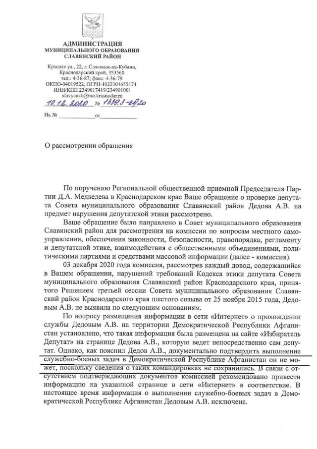 9 ноября 2020 года,представителем инициативной группы было направлено обращение в адрес председателя Всероссийской политической партии «Единая Россия» Медведева Д.А. о проверке депутата Дедова А.В. на предмет установления факта его участия в военном конфликте на территории ДРА, который он указал в своем профиле на сайте "Избиратель-депутат" и которое видят абсолютно все избиратели. На основании данного обращения, проводилась служебная проверка администрации МО Славянского района и получен ответ № 1339.3-05/20 от 10.12.2020 за подписью И.о. заместителя главы муниципального образования Славянского района, управляющего делами А.С. Щеглова, в котором указано, что депутат Дедов А.В. документально подтвердить выполнение служебно-боевых задач в Демократической Республике Афганистан он не может, поскольку сведения о таких командировках не сохранились(подробнее здесь:https://ok.ru/sledafgan/topic/153109216591337).