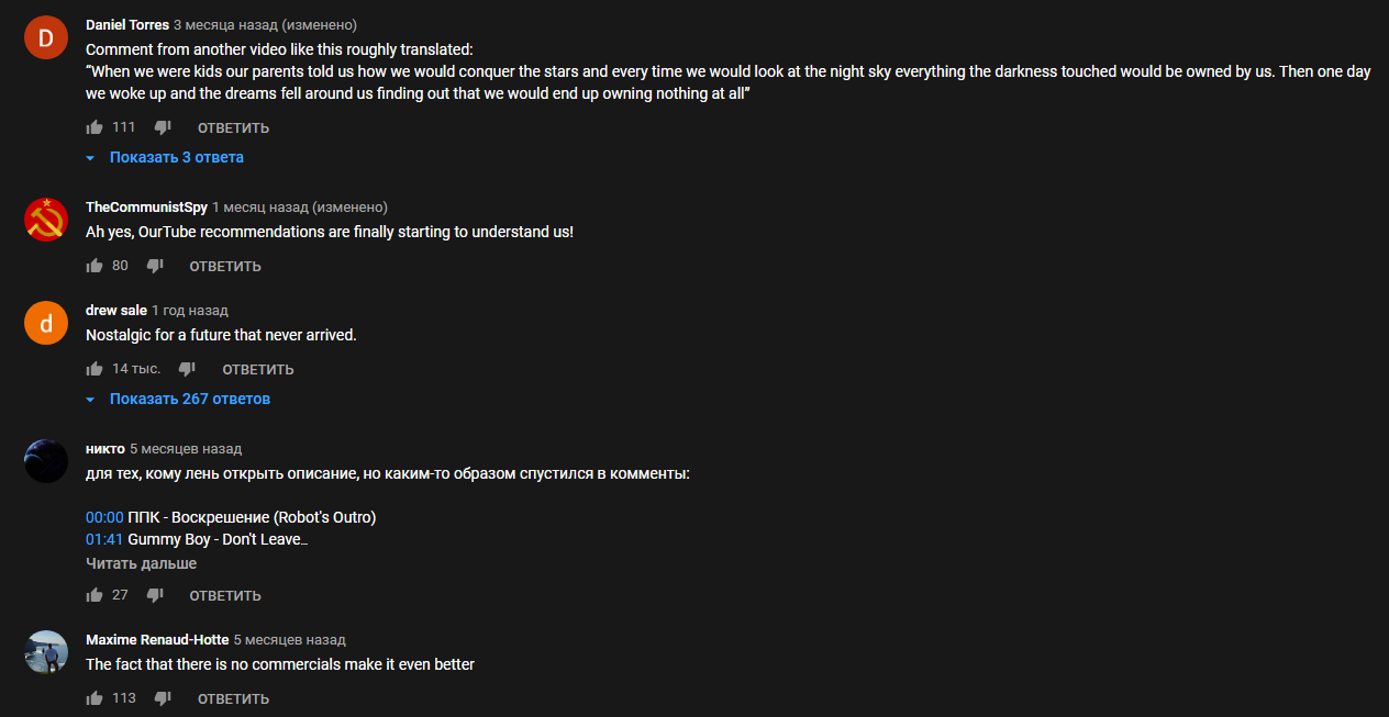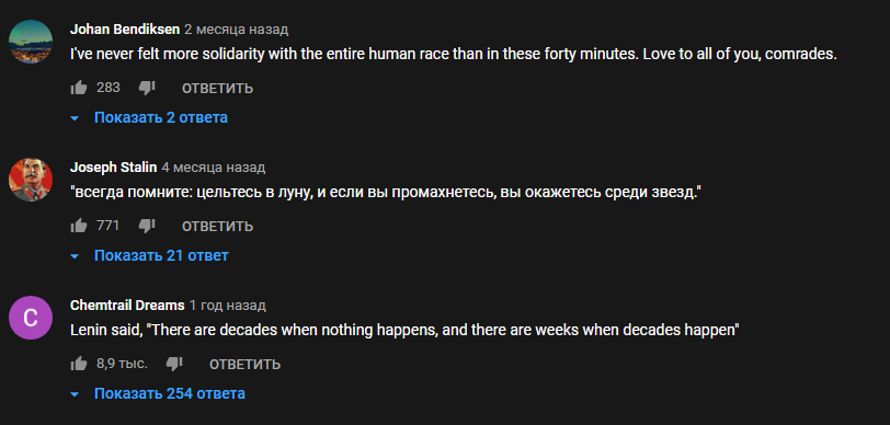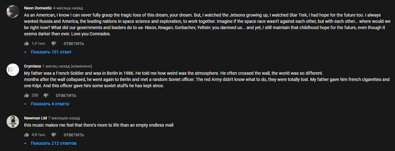 Как американец, я знаю, что никогда не смогу полностью осознать трагическую утрату этой мечты, вашей мечты. Но я смотрел, как росли Джетсоны, смотрел «Звездный путь», у меня тоже была надежда на будущее. Я всегда хотел, чтобы Россия и Америка, ведущие страны в области космической науки и исследований, работали вместе. Представьте, если бы космические гонки были не друг против друга, а друг с другом... где бы мы были прямо сейчас? Что наши правительства и лидеры сделали с нами - Никсон, Рейган, Горбачев, Ельцин: вы прокляли нас... и тем не менее, я все еще сохраняю эту детскую надежду на будущее, даже если оно кажется темнее, чем когда-либо. Люблю вас товарищи.