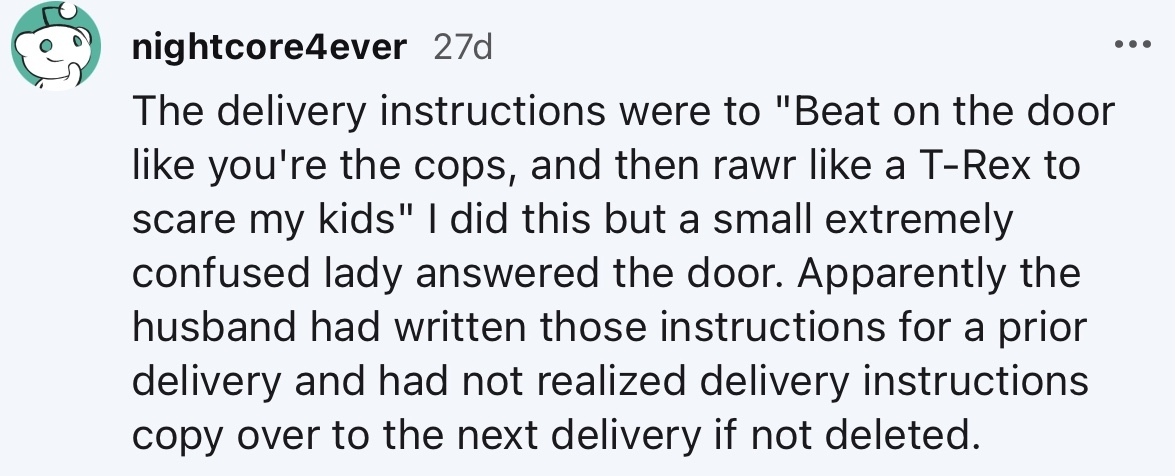 Однажды мне прилетел заказ, а в особых пожеланиях было указано: «Стучитесь в дверь, как будто вы из полиции, а затем рычите, как тираннозавр, чтобы мои дети испугались». Я так и сделал. Дверь открыла хрупкая женщина, она явно была в замешательстве. Судя по всему, ее муж написал этот комментарий для предыдущего заказа, но не понял, что инструкции для предыдущего заказа переносятся на следующий заказ и так и не удалил их.