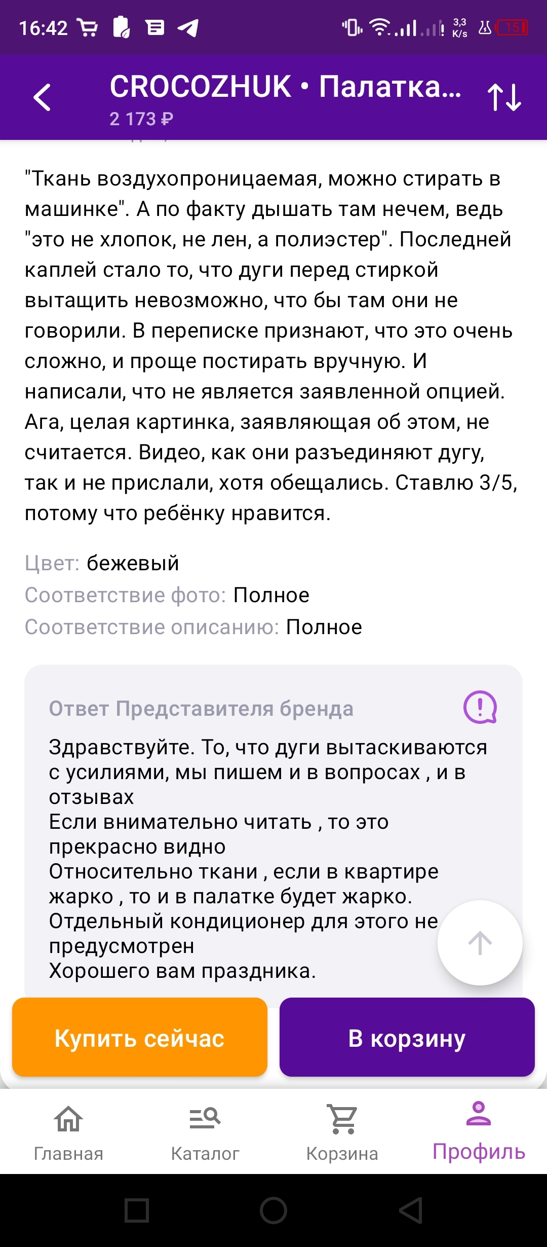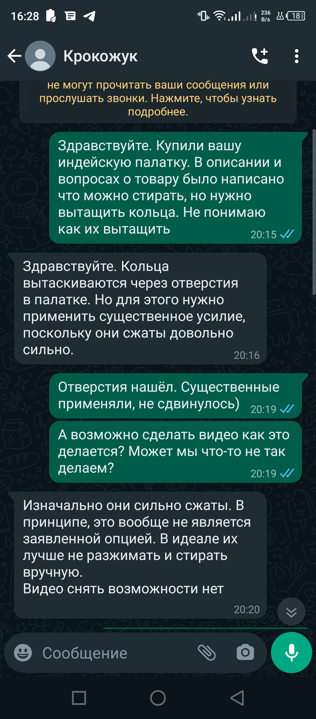 Видео как думаю понятно из скринов, не дождался. Написали отзыв, где собственно все описали и о чудо! Тут же пришел ответ там и в ватсапе. Странно что они отличаются правда? В общем ребята решили забить на собственное обещание. Пост пишу как предупреждение что компания Crocozhuk, продающие детские товары как минимум не совсем честна. Палатка не говно, ребенок рад, но и от заявленного качества, функций отличается явно. А поддержка просто высший пилотаж)