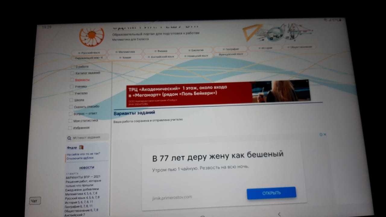 Сын пятиклассник, в конце года будет впр. В школе всех детей попросили зарегистрироваться на сайте решу егэ/огэ/впр. Не проблема! Зарегился ребёнок. Учитель задает домашку на этом сайте. Дома стоит блокировщик рекламы на компе и этот сайт просто виснет с ним и выскакивает надпись, мол, отключите блокировщик иначе работать не будем. Пришлось отключить. Решил задания ребёнок и опа! В конце "ваша работа отправлена учителю" и реклама