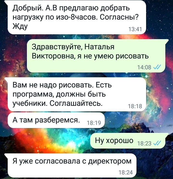 Три года проработала в одной из школ города - миллионника. На четвёртом году прямо в сентябре, я узнаю, что директор зачем-то взял ещё одного учителя русского языка и литературы и щедро поделился половиной моих часов. У меня их осталось 14. Ставка учителя - 18 часов, а в денежном эквиваленте около 15 000 тысяч. До ставки не дотягивает, но у нас же есть несколько часов изо и английского языка! Давайте, берите, не отказываетесь! Как тут можно отказаться, когда зарплаты остаётся только на проезд.