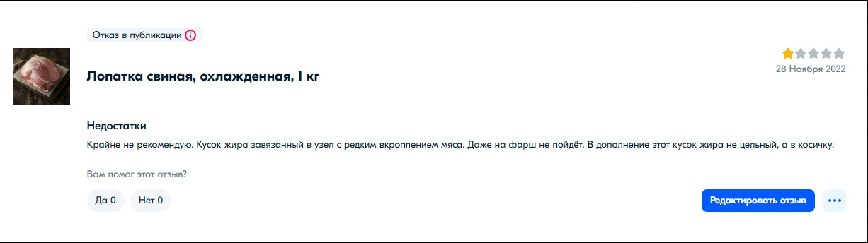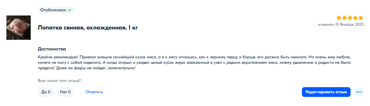 Купил я значит мясо в озоне как-то, а там вместо мяса был жир один. Я человек простой и честный. Денег обратно просить не стал, ибо выкинул его и за воздух мне точно ничего не вернут, а вот отзыв оставил.