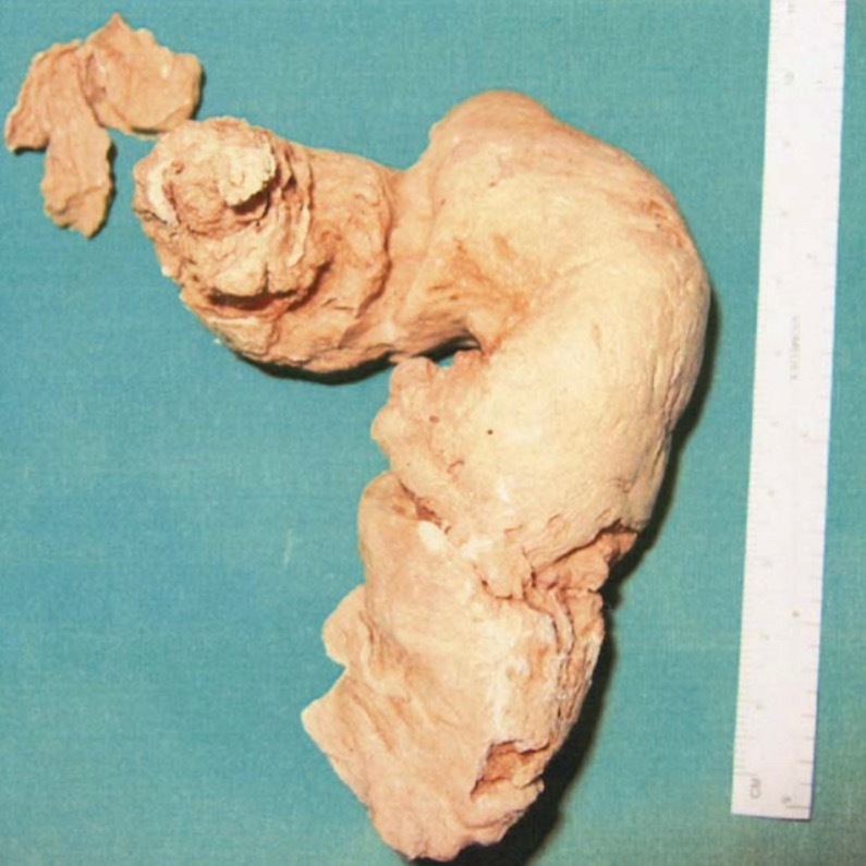 После чего брюшная полость была вскрыта через разрез по нижней средней линии. С помощью нежных манипуляций с ректосигмоидным соединением удалось извлечь твердый как камень материал через задний проход вместе с обильными выделениями слизи и небольшим количеством крови.