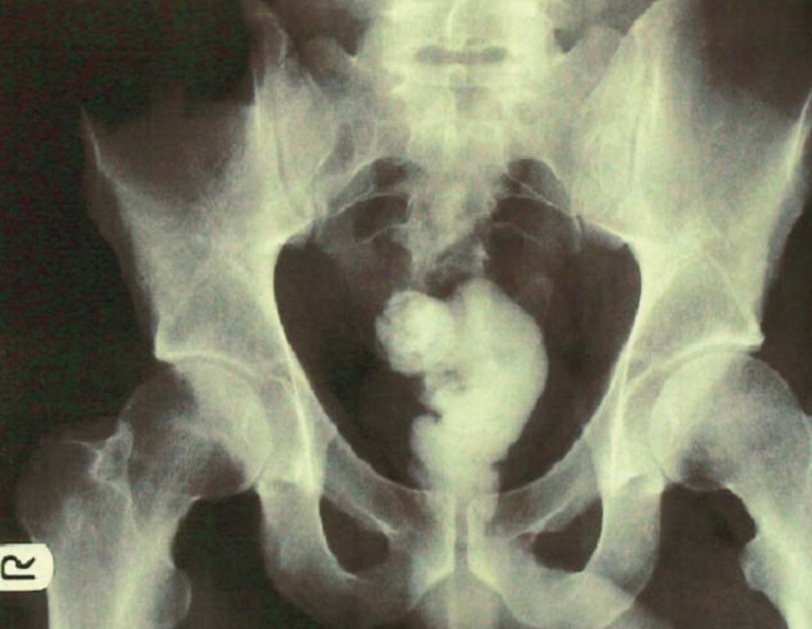 При ректальном исследовании твердое как камень инородное тело прощупывалось непосредственно внутри анального сфинктера. Обычный рентгеновский снимок брюшной полости показал инородный предмет, повторяющий контур прямой кишки, простирающийся от анального канала до ректосигмовидного соединения.