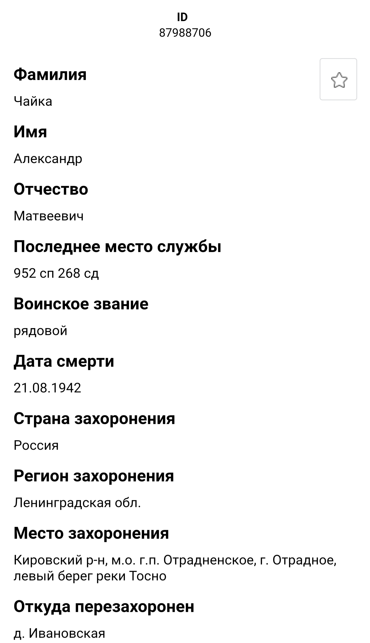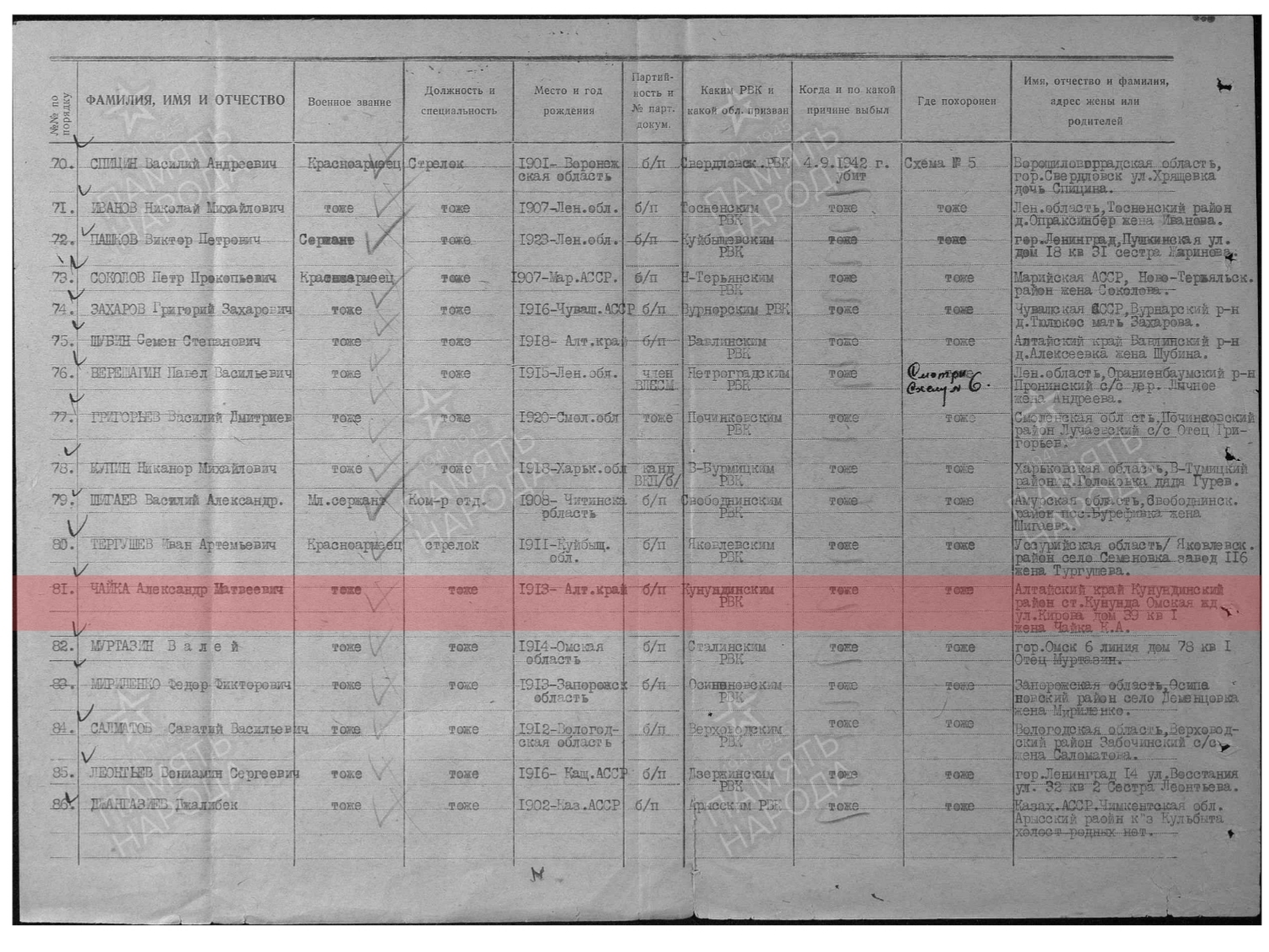 В детстве бабушка всегда рассказывала, что ее отец погиб на курской дуге, но где конкретно она не знала, плакала, говорила что же я за дочь такая что не знаю где похоронен мой отец. В 2009 году бабушки не стало. В 2018 году я узнал о таком сайте как память народа и задался целью найти прадеда. Поиск усложнялся тем, что я не знал ни отчество ни год рождения, знал только имя и фамилию и что он родом с Алтайского края.