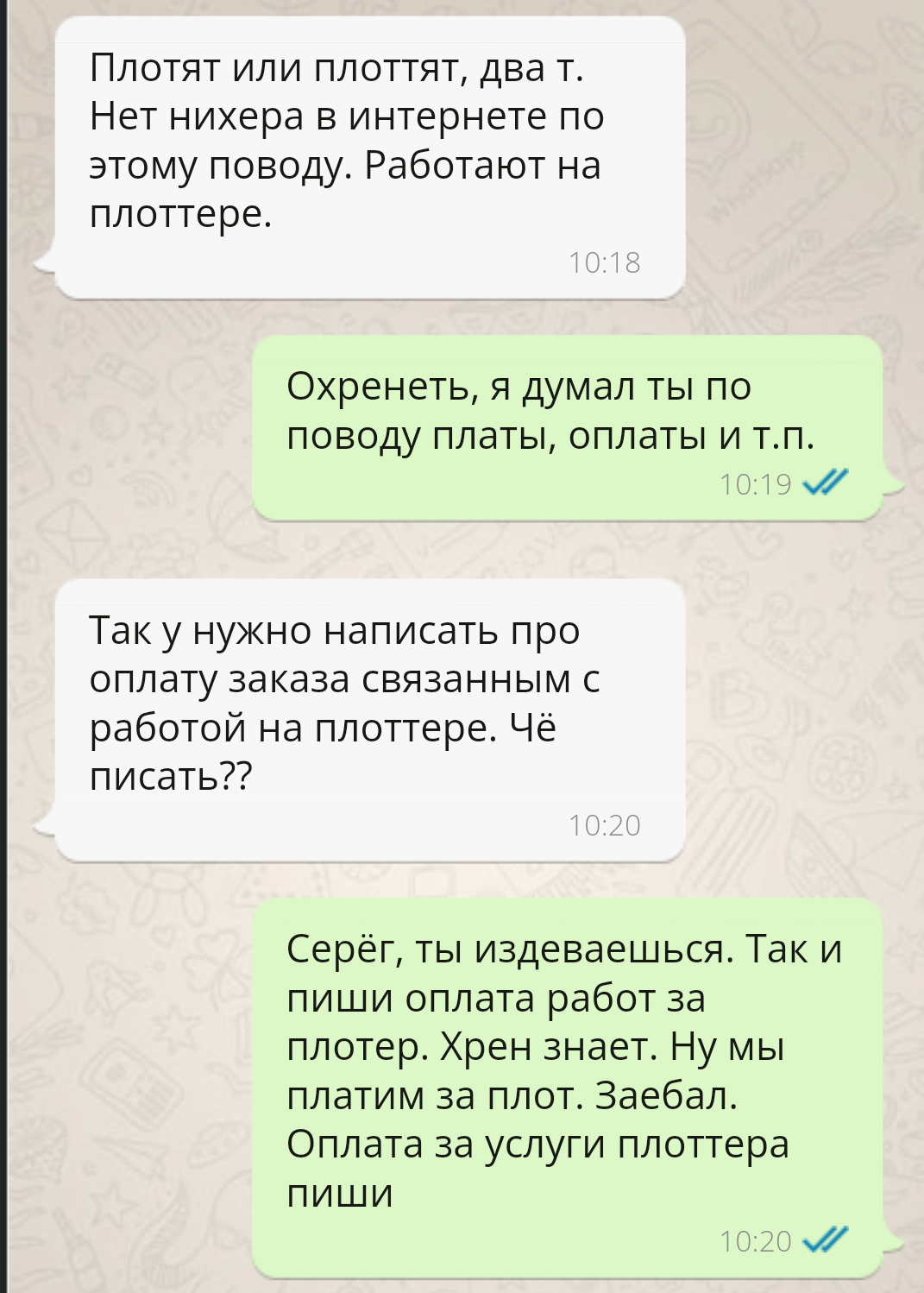 Поговорить? Серьёзно? Я пытался говорить около двух месяцев, вежливо, культурно, чуть ли как Лев Николаевич изъяснялся, но все разговоры игнорировались. Ни разу не нахамил, тембра голоса не повысил. Всё это время меня слали к чёрту, но как только я рванул рубаху....захотели поболтать по душам) За что и были вежливо посланы в направлении пяти букв. Ей Богу, у этих людей хватает совести затирать мне про то что я не пытался договориться. Они не принимали всерьёз мои причины сильно не задерживаться, иногда до поздна. Проще говоря: чхать они хотели на то что у меня есть жизнь, и сторонняя учёба впридачу. Полагаю, теперь я имею полное право начхать на их трудное положение и хлопнуть дверью. Мне столько не платят, чтобы терпеть это хамство.