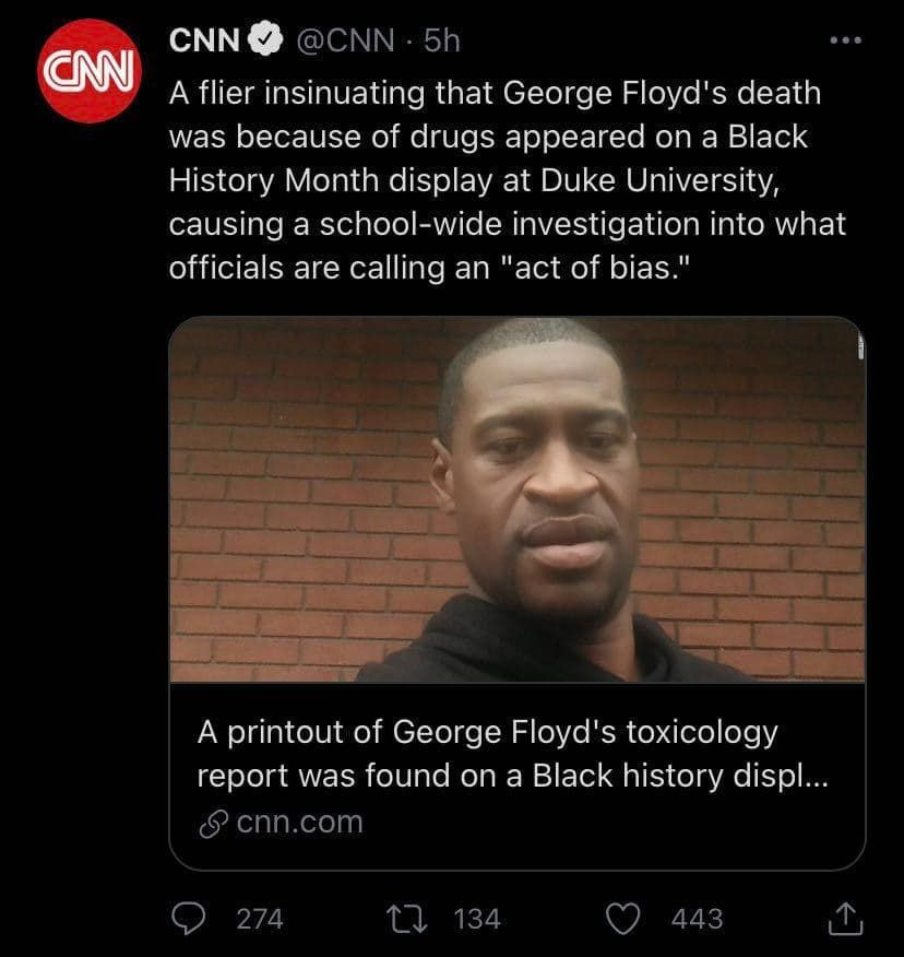 Кто-то повесил листовку, намекающую на то, что смерть Джорджа Флойда была вызвана наркотиками, на выставке месяца черной истории в Университете Дьюка, вызвав общешкольное расследование того, что чиновники называют "актом грубейшего расизма"