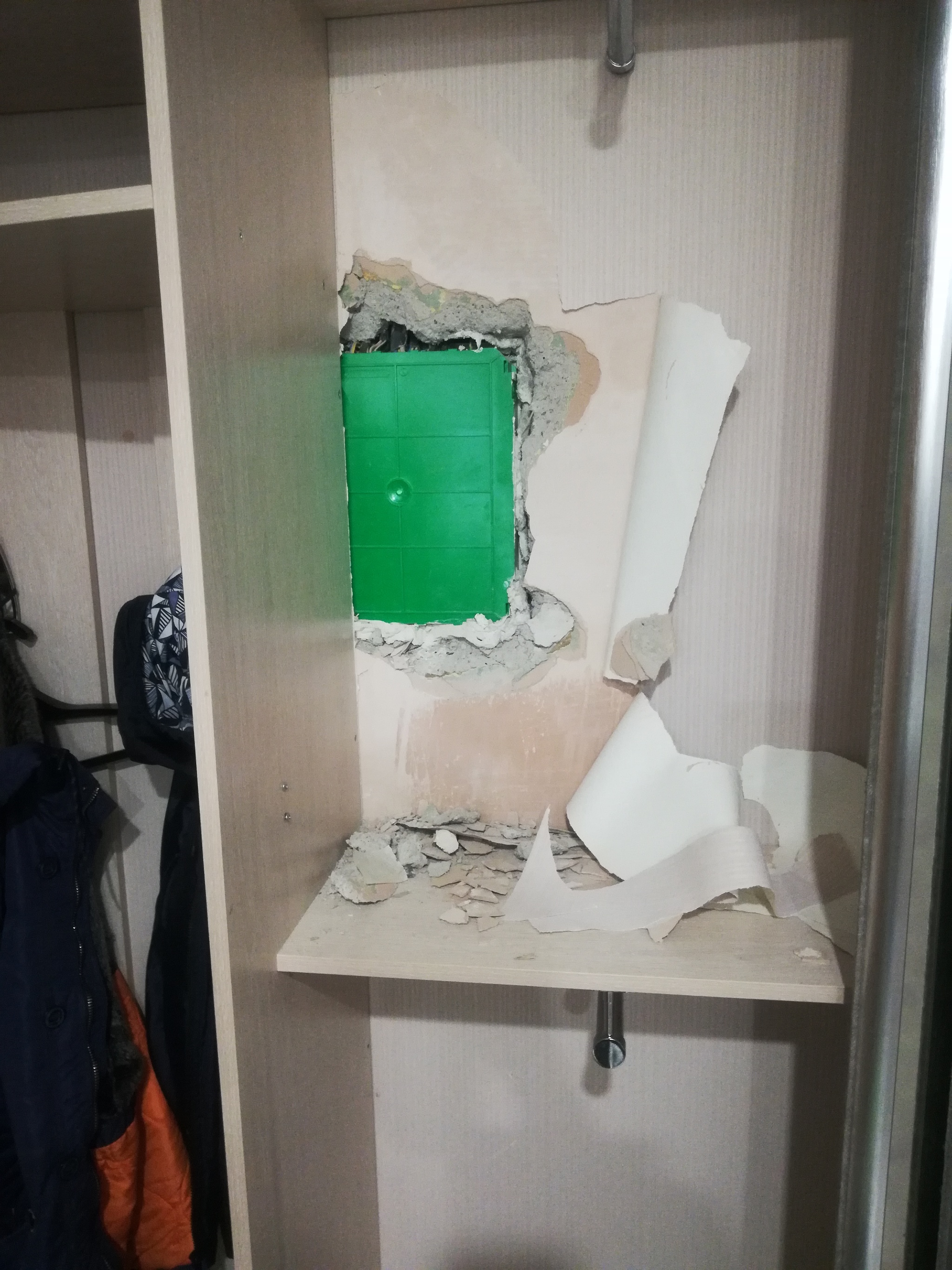 До двух часов ночи отмываю холодильник. Закончил, не помню зачем открыл шкаф-купе в коридоре и увидел это. Сосед прохуярил смежную стену насквозь и ничтоже сумняшеся воткнул свой электрический щит. Долбоеб. Сейчас проснулся и собираюсь его навестить, предложу добровольно убрать щиток и восстановить стену. В успехе не уверен, ибо есть предположение в неадекватности гражданина-соседа... Откажется - управляющая компания, акт оценки ущерба, претензия, суд... Не такого начала года я ожидал...))