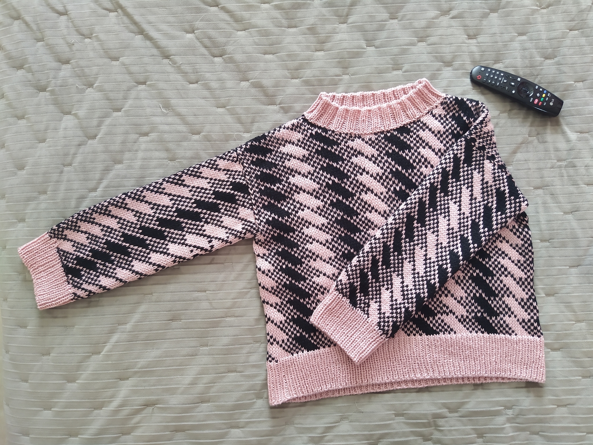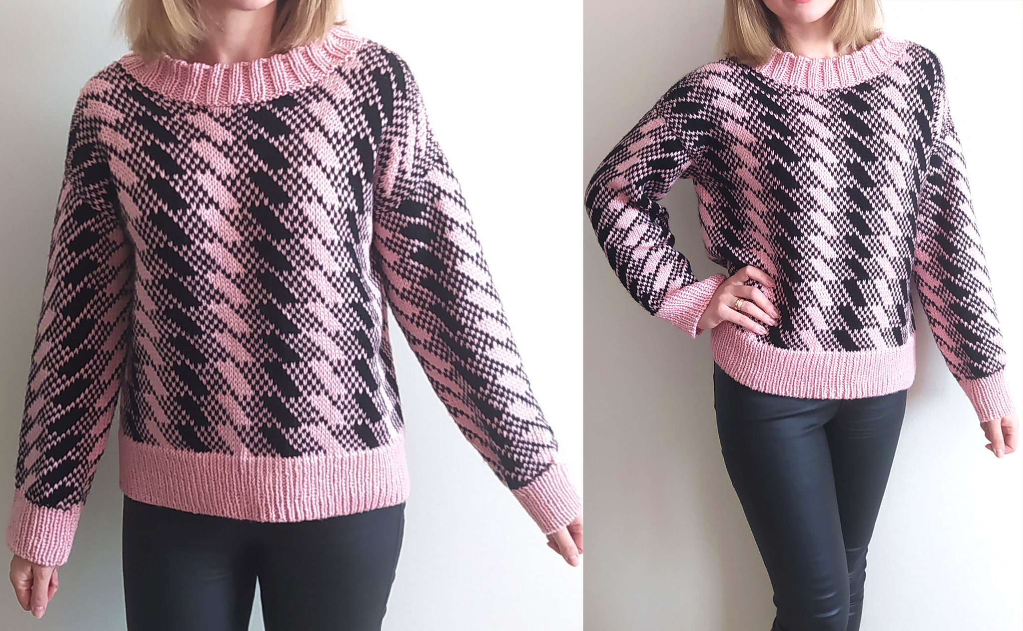 Схему рисунка я набросала от руки, она совсем некрасивая, поэтому выложу ее в комментариях, кому интересно, смотрите. Исходила из того, что однотонные параллелограммы состоят из 5 петель, двухцветные - из 6ти чередующихся. В каждом ряду сдвиг цвета влево, высота фигур - 6 рядов. После шестого ряда рисунок сдвигается на исходную позицию. Расчет количества петель всегда индивидуальный, в моем случае было 198 петель (по 99 петли на перед и спинку), рисунок замыкается по кругу. Но в принципе можно было и больше полос (раппортов) делать, был бы более свободный "оверсайз".