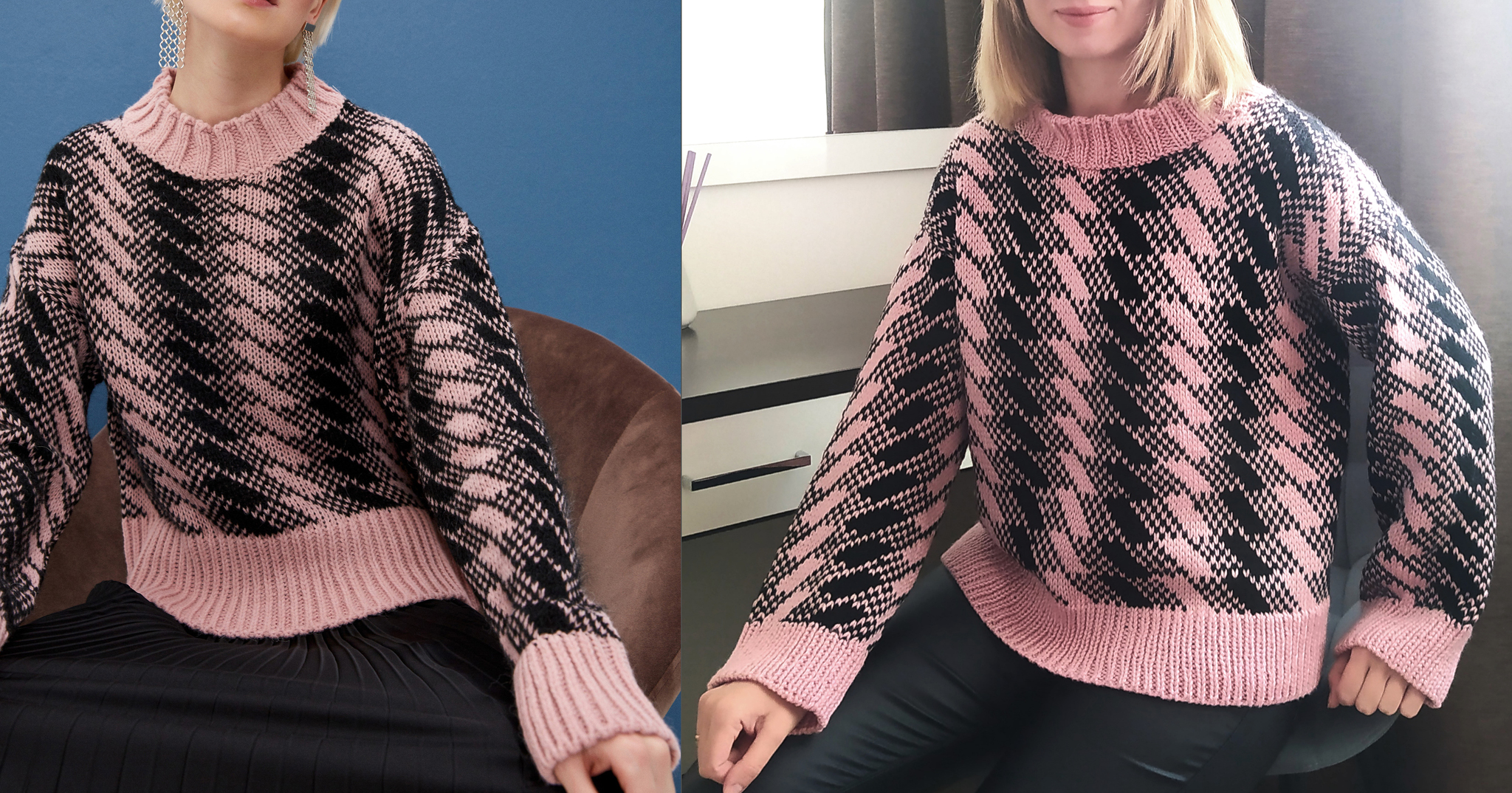 Наверное, сразу бросается в глаза, что резинки внизу свитера, на вороте и на манжетах в моём варианте смотрятся более узкими относительно общей длины. Честно говоря, я сама не совсем понимаю почему так вышло - вязала я свитер снизу вверх, соответственно, начинала с нижней резинки, связала то же количество рядов, как в оригинале, но чисто визуально она мне показалась прям намного шире, чем должна быть и я несколько рядков распустила. Ну и собственно, пока не поставила рядом эти 2 фото, мне казалось, что всё нормально. Думаю, так вышло потому, что точно оценить все соотношения можно только видя изделие полностью, а когда вяжешь на глаз и нет еще ничего, кроме одной из деталей, сложно спрогнозировать что в итоге получится.