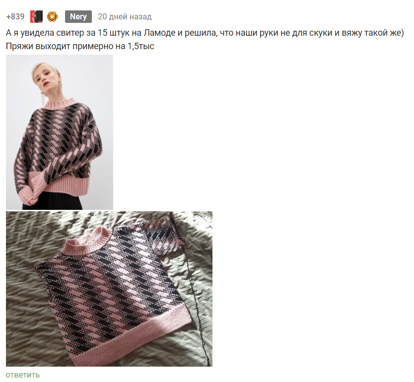 Так вот, УРА-УРА-УРА, я довязала свой свитер, уже пару раз его надевала и готова выполнить обещание - показать его конечный вид и рассказать о процессе. Сразу оговорюсь, если бы я могла себе позволить его купить, то я бы так и сделала, ничего бы не вязала и не было бы этого поста. Ноооо, как говорится, наши люди в булочную на такси не ездят©.. в общем, вы поняли, дорого. Это я к тому, что на полную идентичность с оригиналом не претендую, да и сама ручная вязка не всегда бывает идеальной, но я всё равно довольна как слон!!!