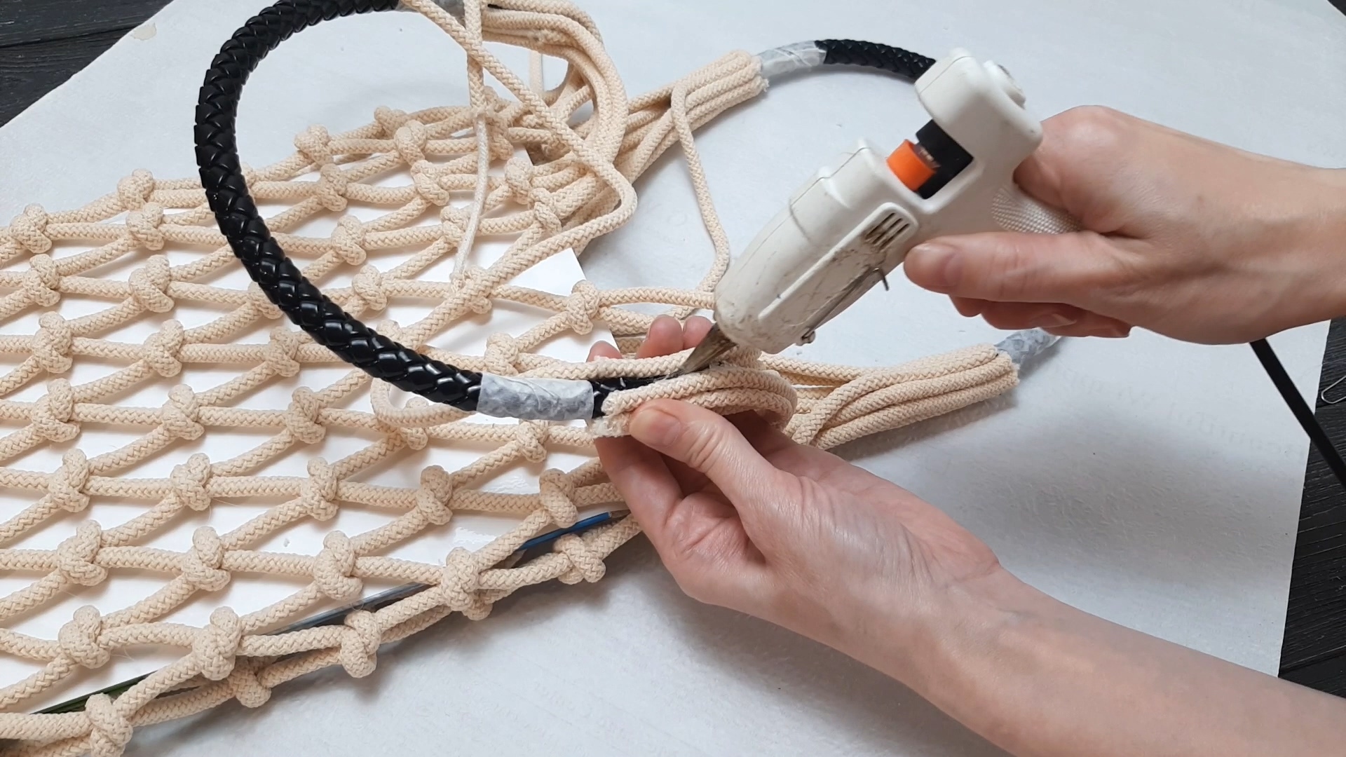 Приклеиваю на клей пистолет вокруг ручки шнуры, а одним еще и обматываю по кругу.