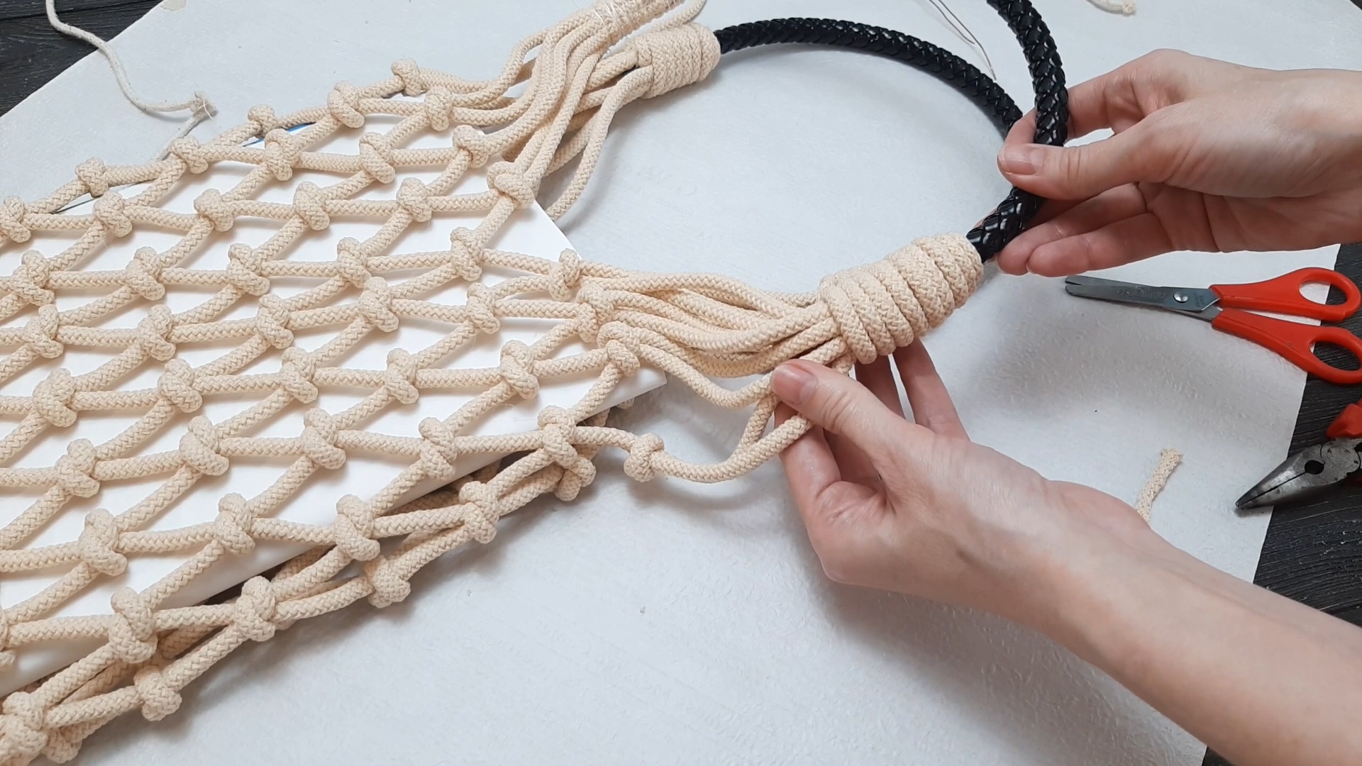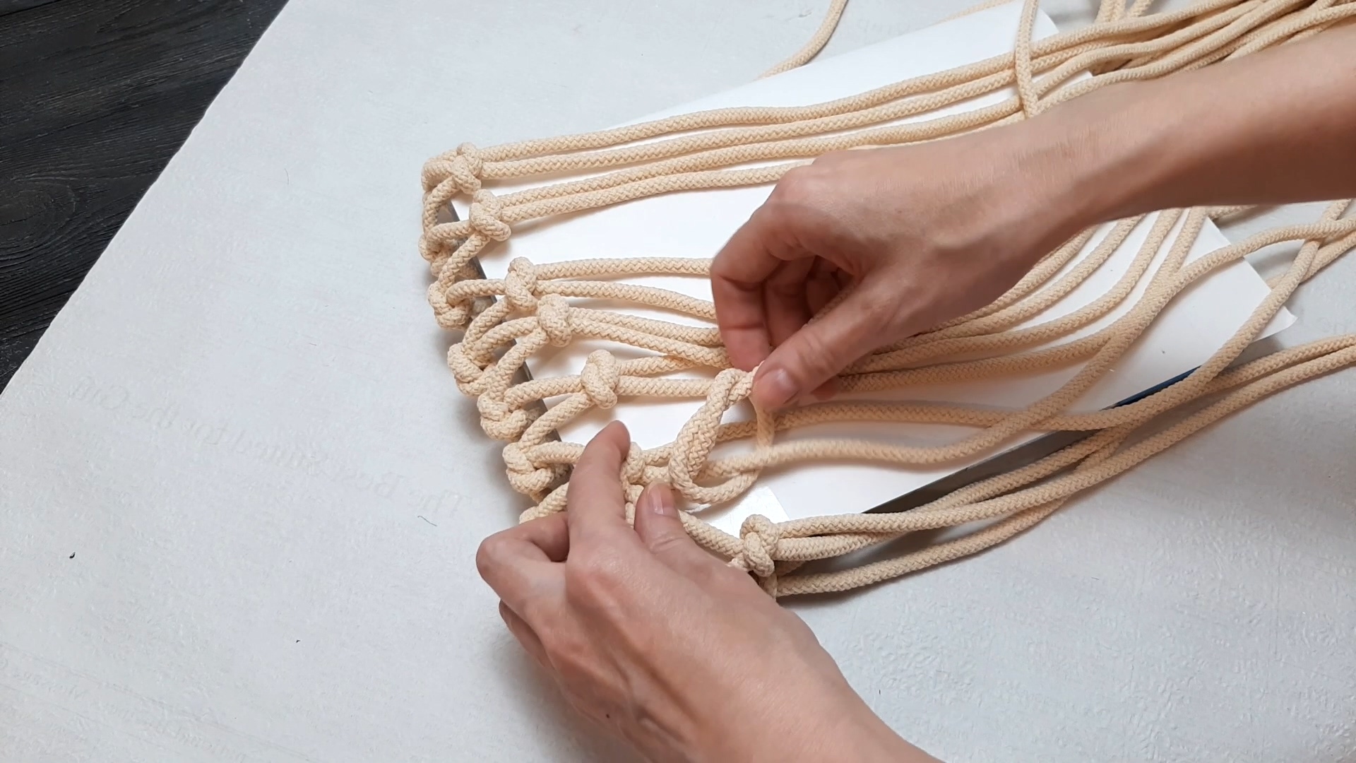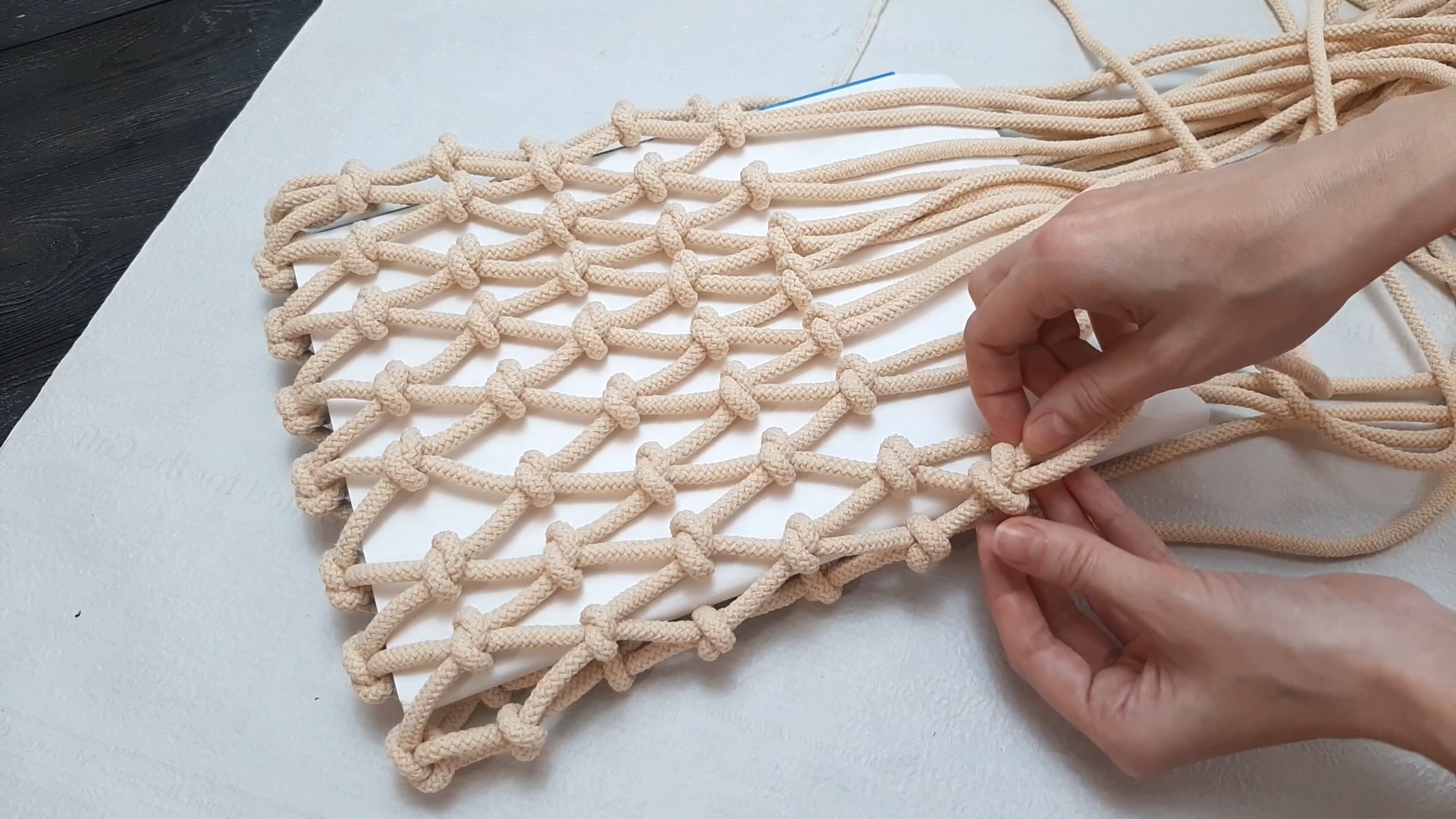 С помощью книжки, сгибаю всю эту паутину пополам и продолжаю плести узлы по кругу до самого верха.