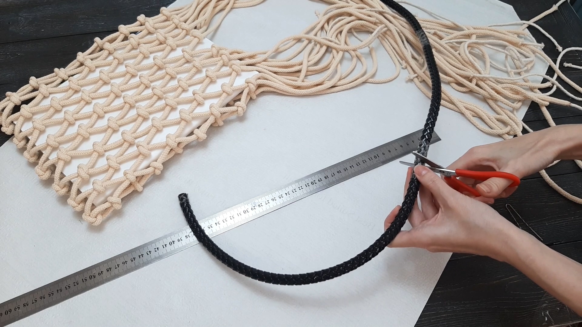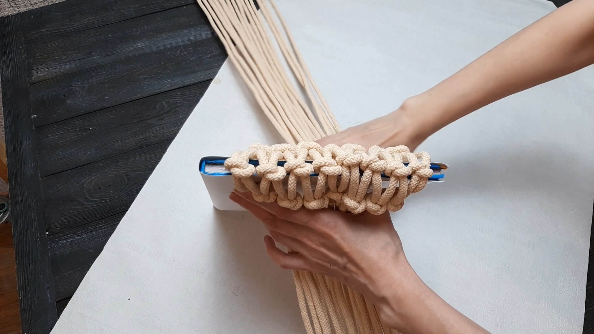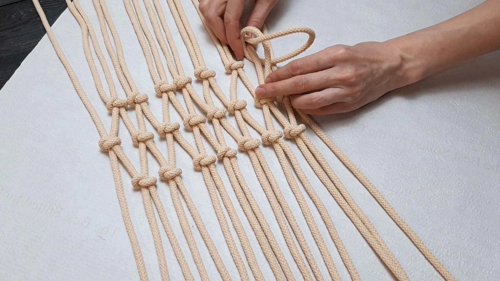 С помощью книжки, сгибаю всю эту паутину пополам и продолжаю плести узлы по кругу до самого верха.