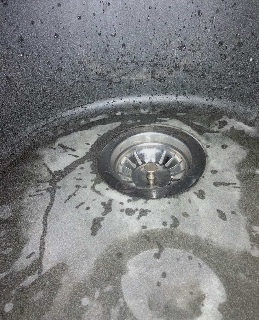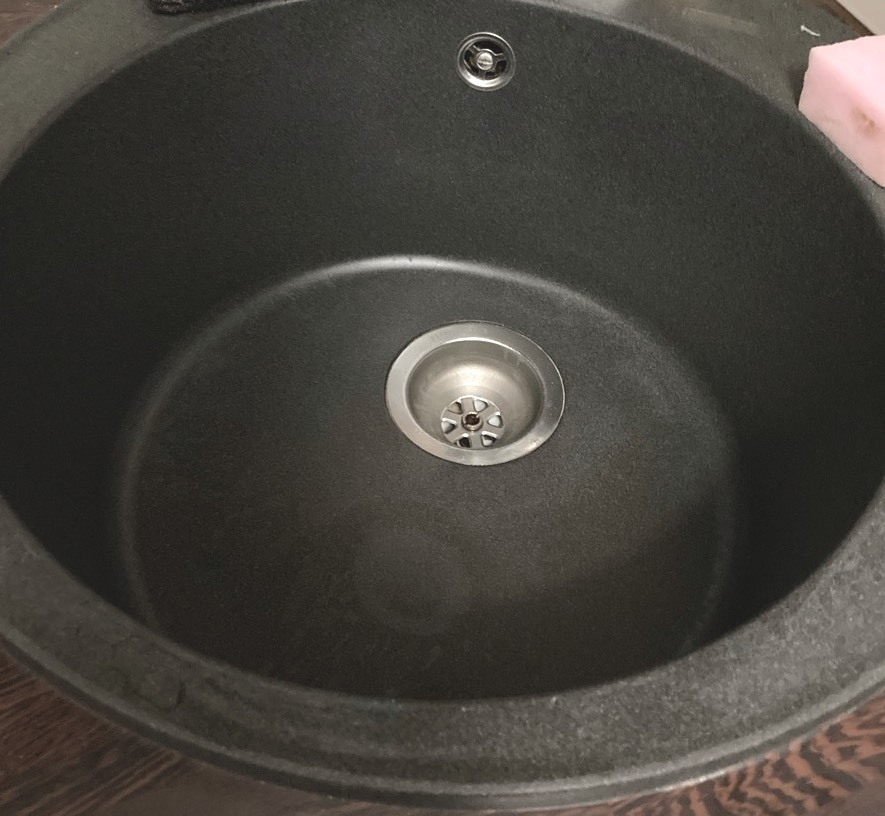 Решила устранить засор специальным средством от засоров. Оно осталось на ночь на черной композитной мойке. Как итог - цвет мойки в сухом состоянии - белый.