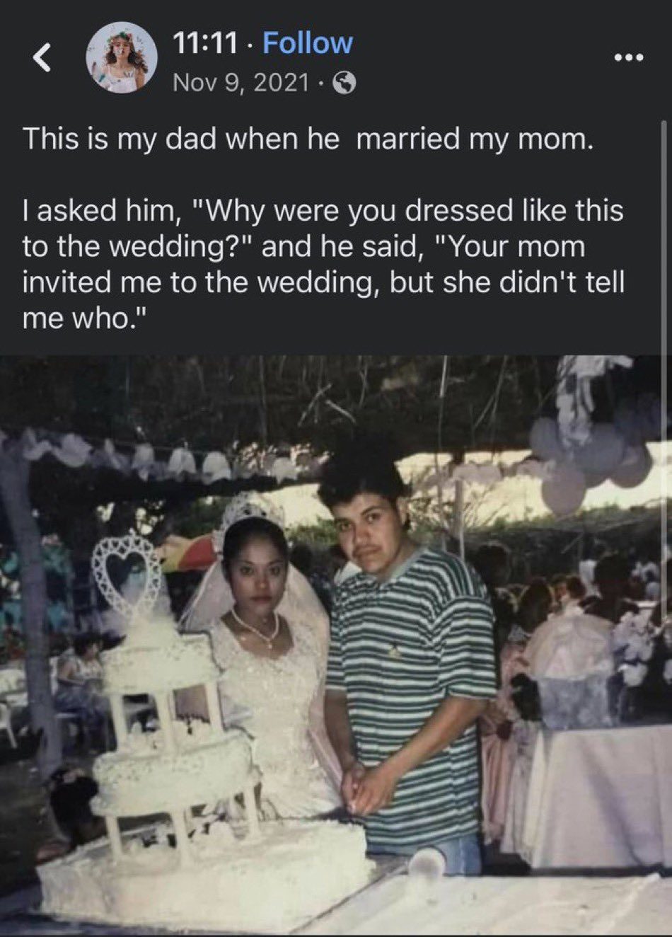 Я спросил его: Почему ты был так одет на свадьбе? И он ответил: Твоя мама пригласила меня на свадьбу, но не сказала мне чью =)
